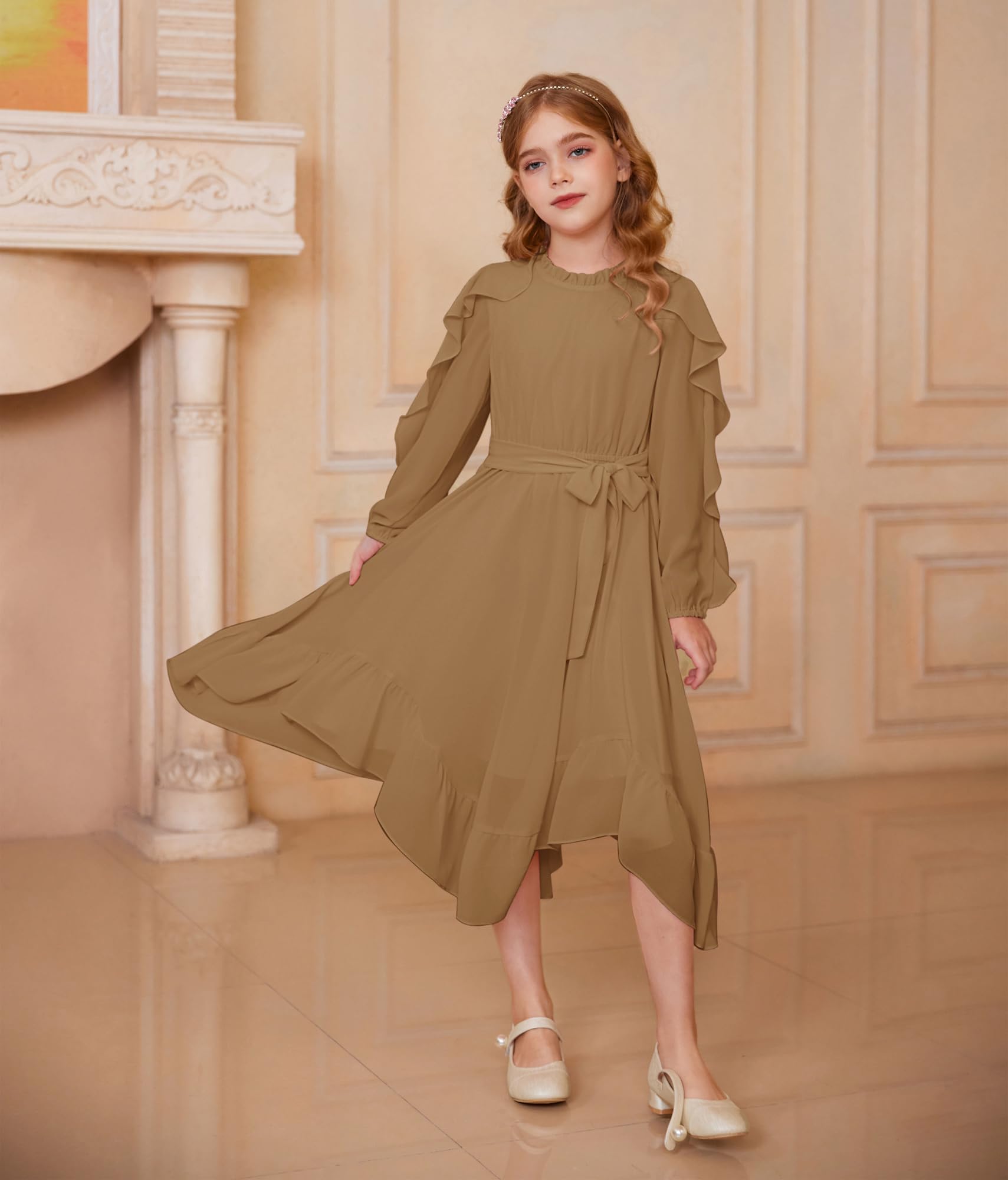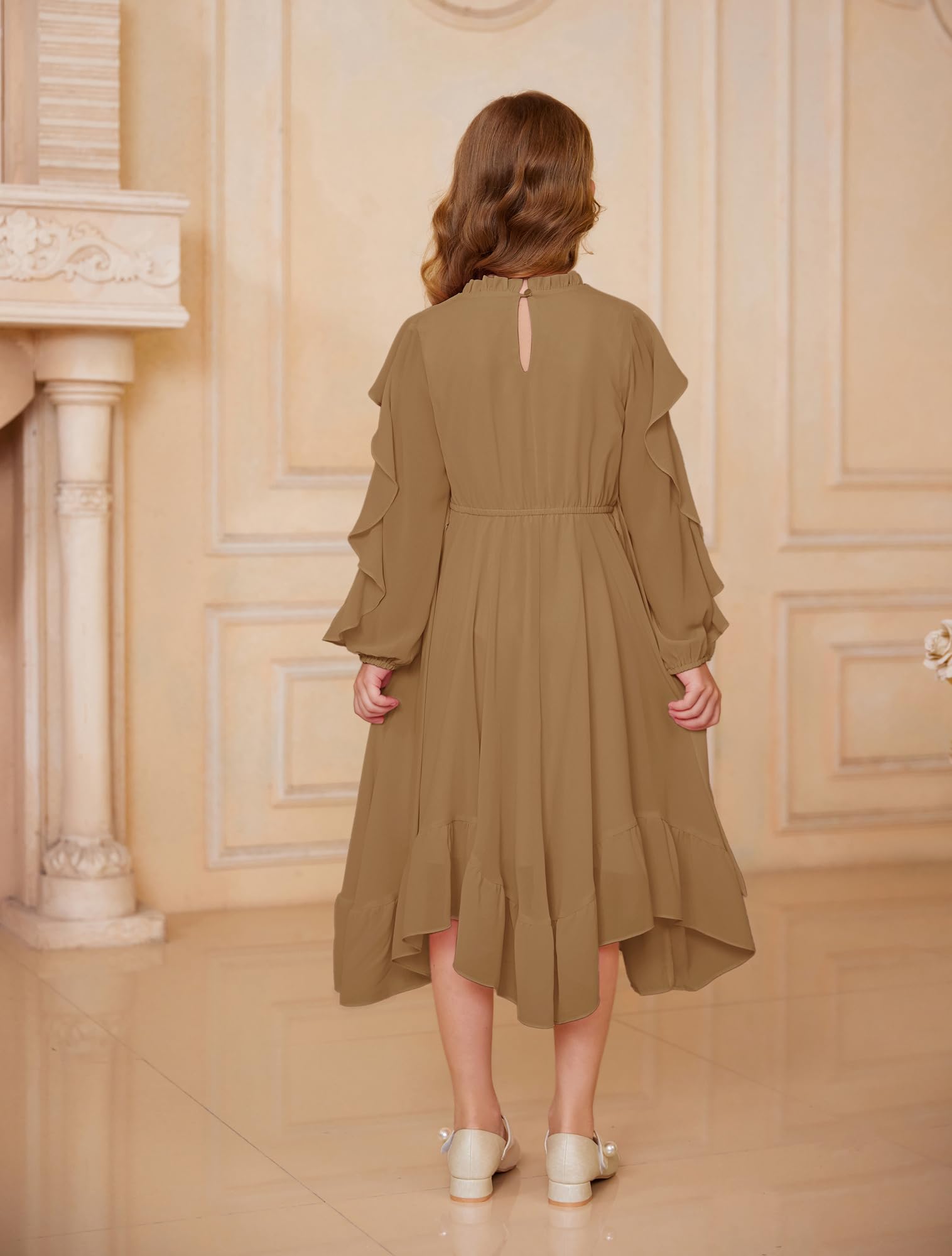 - [Captivating Design]: Our girls' dress showcases a stunning high-low hemline that twirls beautifully with every movement. The ruffled long sleeves and delicate waist tie create an enchanting silhouette, perfect for making your little one feel like a princess at any event.