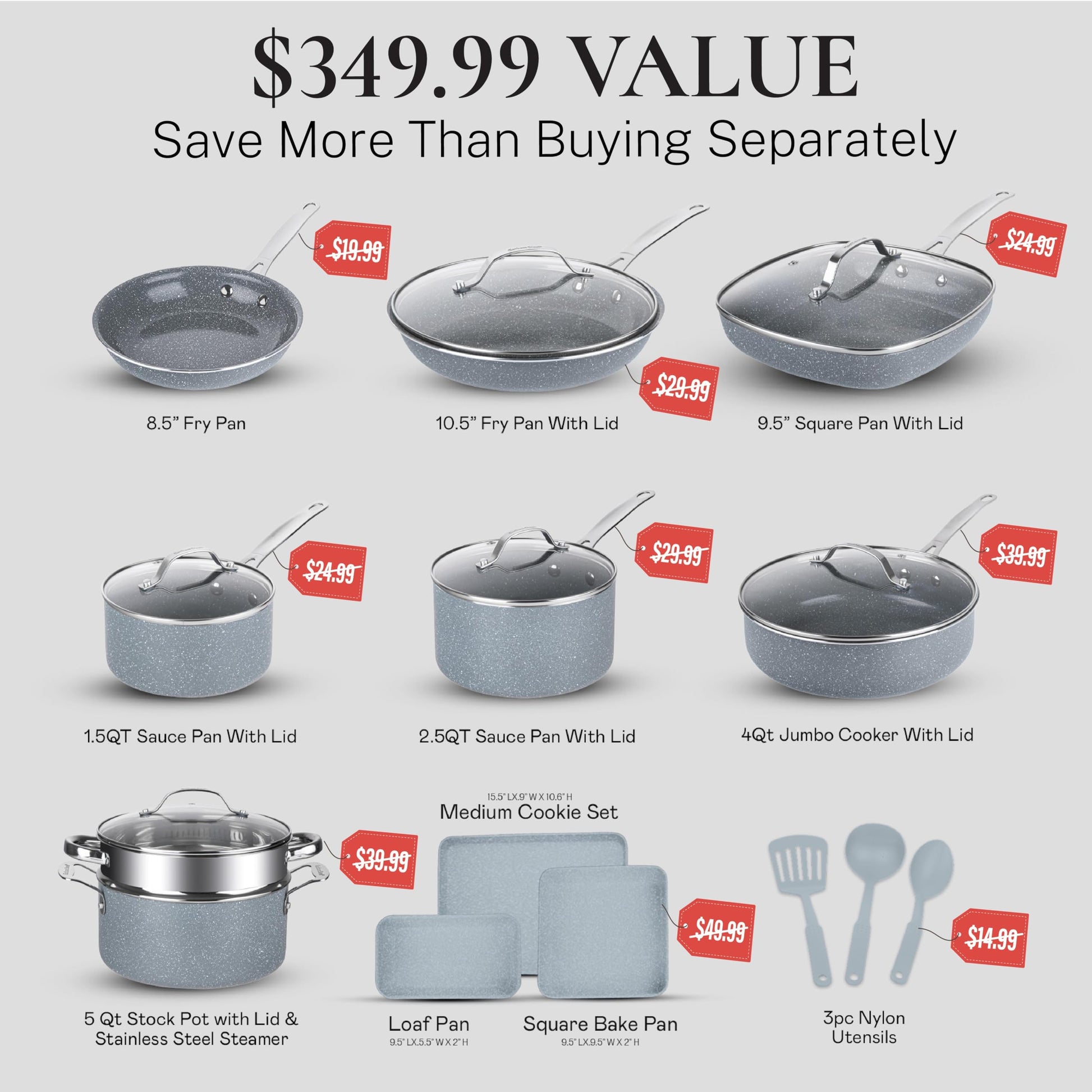 - COMPLETE KITCHEN IN A BOX: This 20 Pc non toxic cookware set includes everything you need to completely outfit your kitchen and take cooking and baking to the next level, includes a full cookware set with a 8.5” frying pan, 10” frying pan, 9.5” square frying pan with, 1.5 QT saucepan with lid, 2.5Qt saucepan with lid, 5 QT stock pot with lid and stainless steel steamer, a 4 QT jumbo cooker with lid, plus a complete baking set with cookie sheet/jelly roll pan, loaf pan, square pan and 3 cooking utensils!
