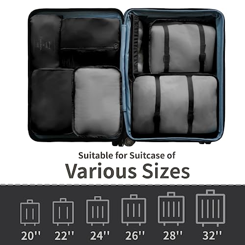 - Multiple Sizes - 8-pack different sizes of packing cubes for suitcases can fit in most common suitcases, such as sized 20”, 24”, and 28”, also suitable for handbags, travel bags, backpacks, and duffel bags. You can take 1 cube as a carry-on item to reduce the weight of your checked baggage.