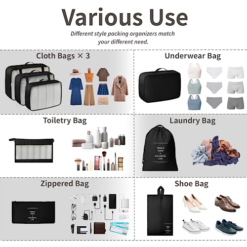 - Multifunctional Storage - Our packing cubes comes in 8 pcs, including cloth bag for 3 sizes, underwear bag, shoe bag, laundry bag, zippered bag, toiletry bag, to meet your different storage needs when you travel. Large interior volume holds all your travel clothing, shoes, makeup, shaving accessories, keys, charger, usb data cable and more.