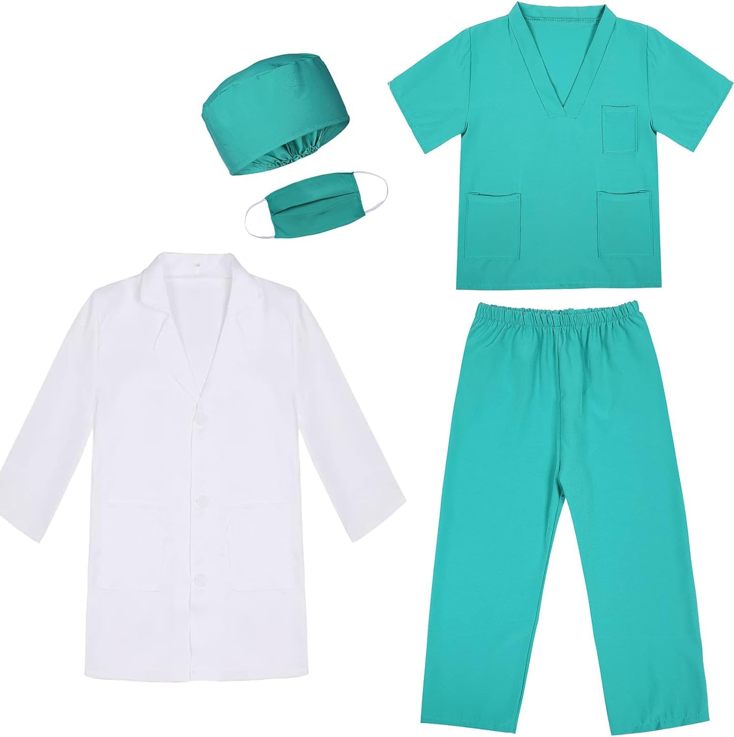 - Complete Dress Up Set: This 8-piece doctor costume kit includes a crisp white lab coat, teal scrubs, mask and surgical caps, a stethoscope, ID badge, prescription pad, and adorable glasses. for realistic medical role-play.1 toddler doctor costume set for two kids or more to participate in this doctor game together, one kid can wear a white doctor coat while the other kid wears a kids scrub as assistant to take care of the patient together