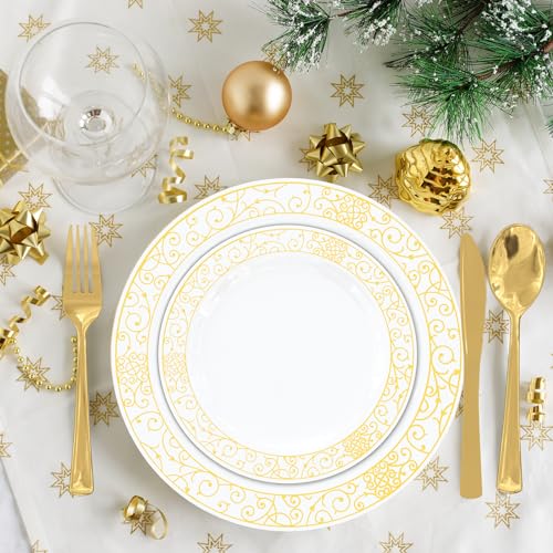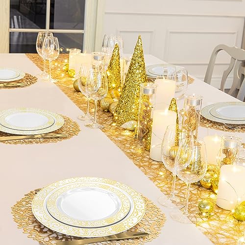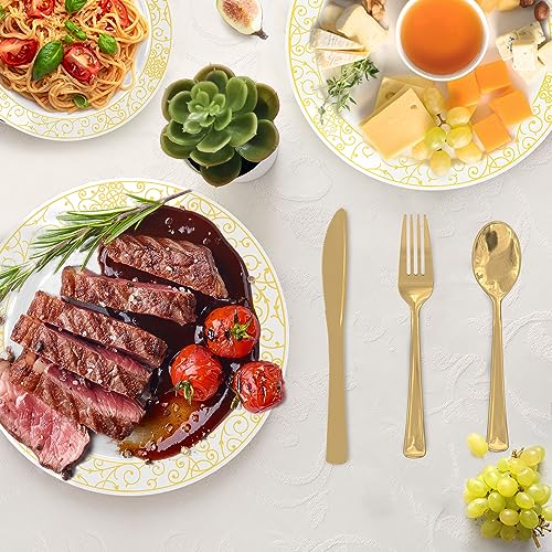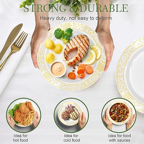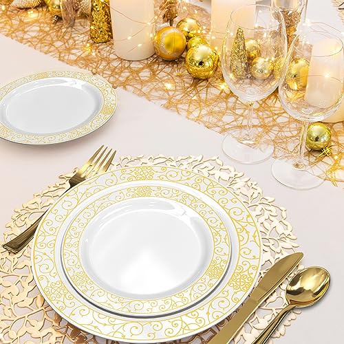 - PREMIUM FOOD GRADE MATERIALS - Our plastic dinnerware sets are 100% made of BPA-free, non-toxic food-grade plastic, you don't need to worry about possible health issues from disposable plates. Plastic dinner plates are more functional than paper plates. It can be used with hot or cold food without oozing juices, gold plastic plates enhance the quality of the party. .(Not microwave, dishwasher, oven safe)