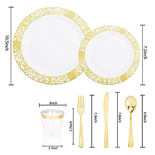 GreenElevate Plastic Plates, 150 Pieces Disposable Plates Plastic Dinnerware Set for 25 Guests: 25 Dinner Plates, 25 Dessert Plates, 25 Forks, 25 Spoons, 25 Knives, 25 Cups, Gold Party Plates
