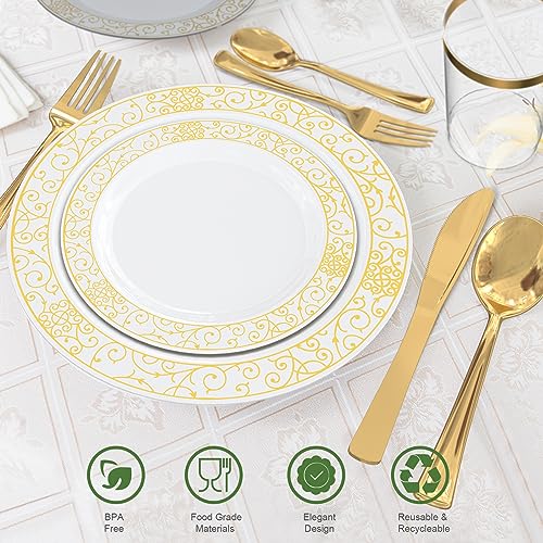 - PREMIUM FOOD GRADE MATERIALS - Our plastic dinnerware sets are 100% made of BPA-free, non-toxic food-grade plastic, you don't need to worry about possible health issues from disposable plates. Plastic dinner plates are more functional than paper plates. It can be used with hot or cold food without oozing juices, gold plastic plates enhance the quality of the party.(Not microwave, dishwasher, oven safe)
