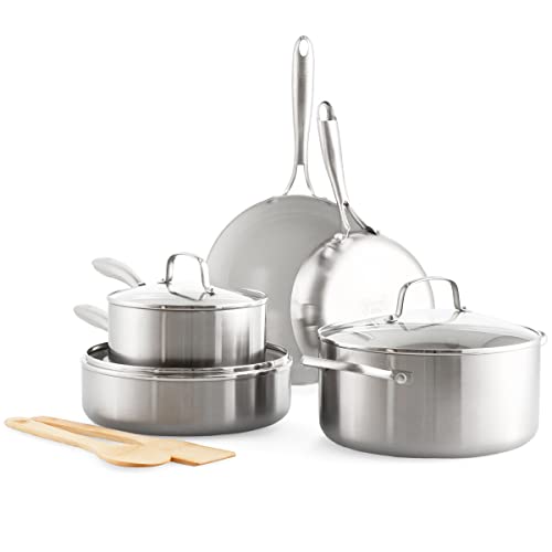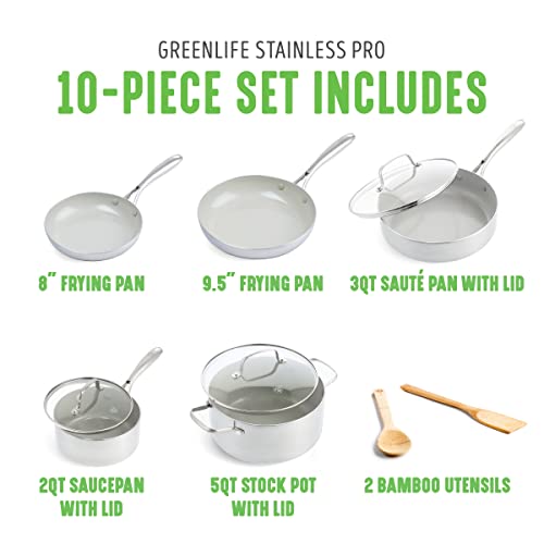 GreenLife Tri-Ply Stainless Steel Healthy Ceramic Nonstick, 10 Piece Cookware Pots and Pans Set, PFAS-Free, Multi Clad, Induction, Dishwasher Safe, Oven Safe, Silver