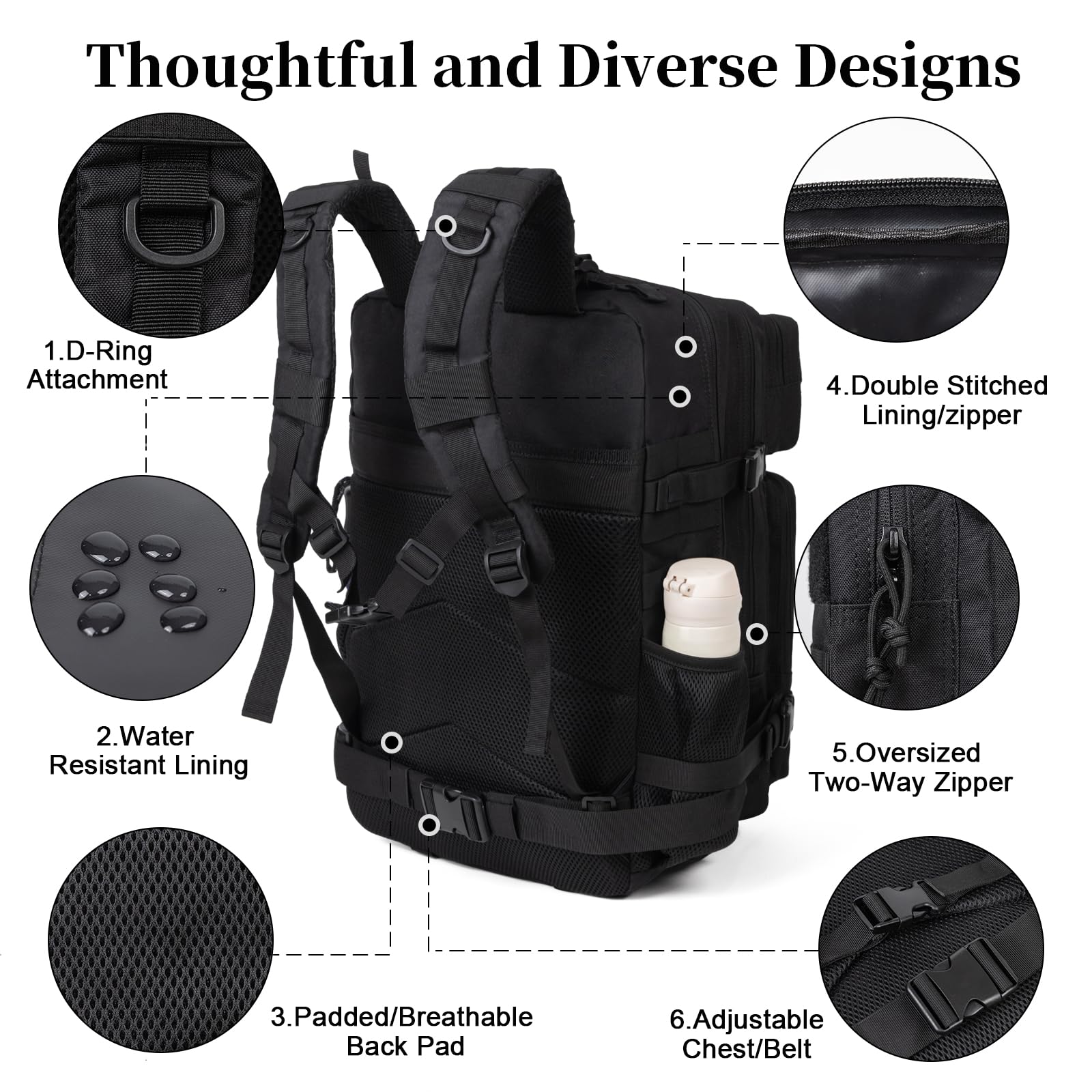 - 💖Upgraded Tactical Backpack: We upgrade the tactical backpack according to the market situation, the size: 19.7" x 12.6" x 11.8" size and 45L capacity to meet all your needs for holding gear. At the same time, it has also upgraded and added a bottle pocket on the side that can hold an 800ml water bottle for your convenience, and there are also spacious multi-layer internal storage compartments that can accommodate a large number of outdoor equipment to meet your daily travel needs.