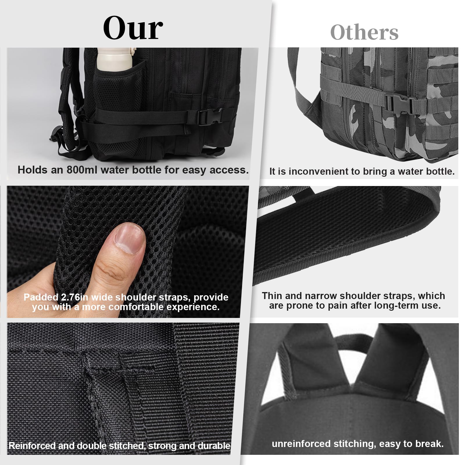 - 👍Thoughtful and Versatile Design: The molle backpack has a webbing system that allows you to combine it with other equipment, such as walkie-talkie bags, first aid bags, and so on. Wide padded shoulder straps and a breathable mesh padded back area provide a comfortable, ventilated feel during travel. All compartments have two-way openings for easy access. The easy-to-adjust waist and chest straps prevent the military backpack from vibrating when walking and bring you a comfortable experience.