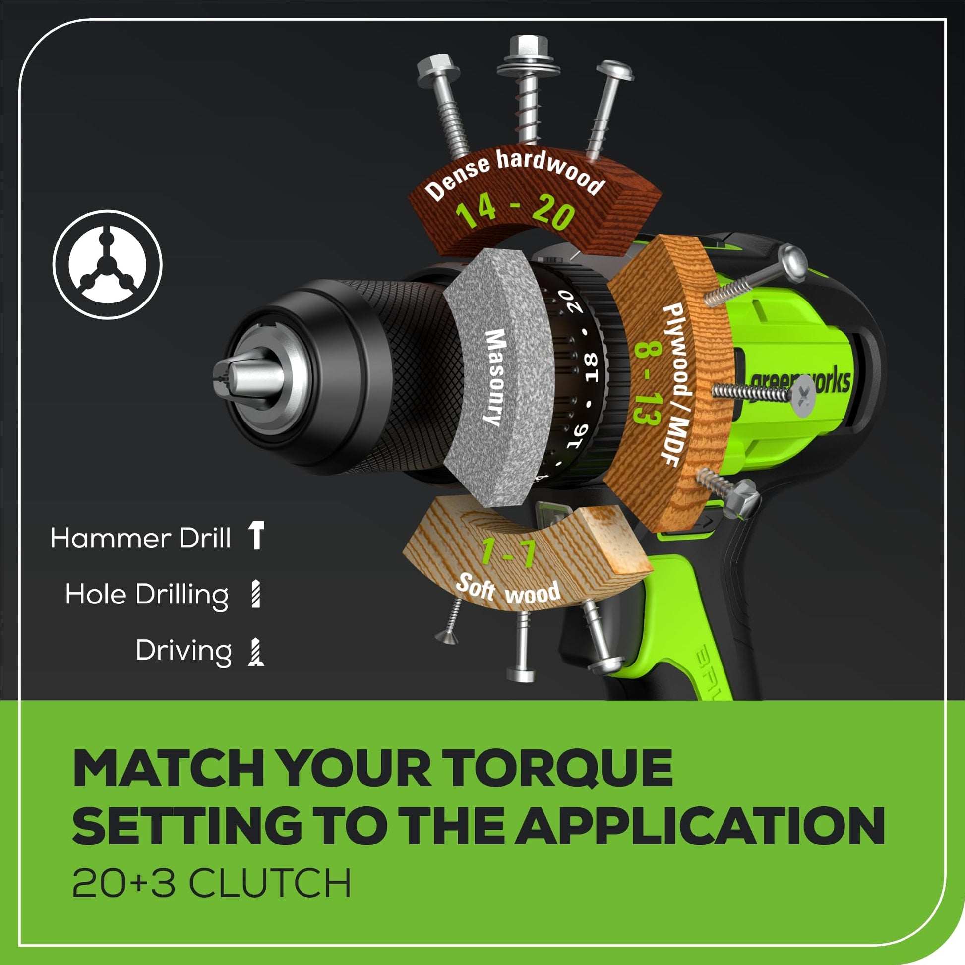 Greenworks 24V Brushless Cordless Hammer Drill/Drill Driver with Battery & Charger, 530 in-lbs Torque, 1/2” Keyless Chuck, Variable Speed Control, Included 5 pcs Drill Bits