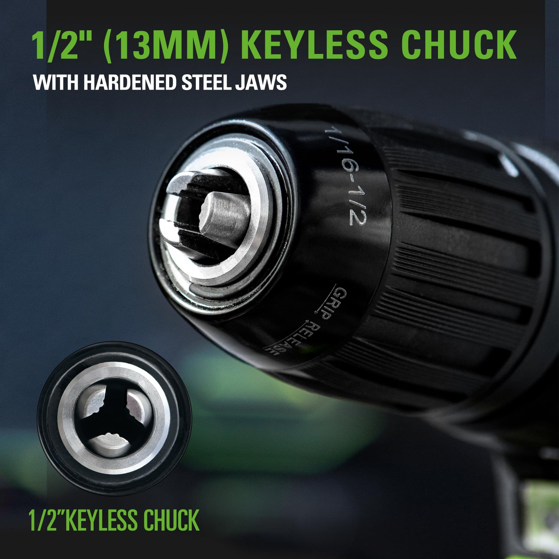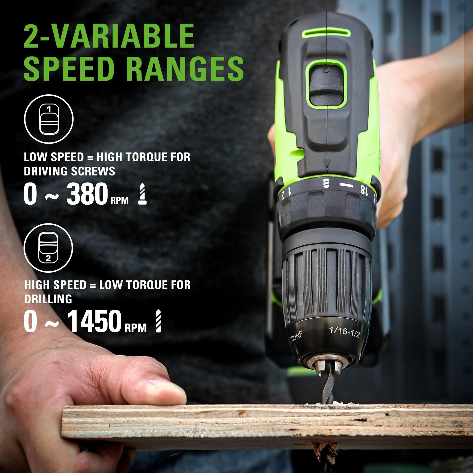 - 【1/2 In. Drill Driver】 2 speed transmission (0-380RPM/0-1450RPM), 310 in-lbs (35Nm) torque, 18 + 1 position clutch with 1/2 in. Keyless chuck offers precise speed control and torque adjustment when drilling holes and driving screws on different surfaces.