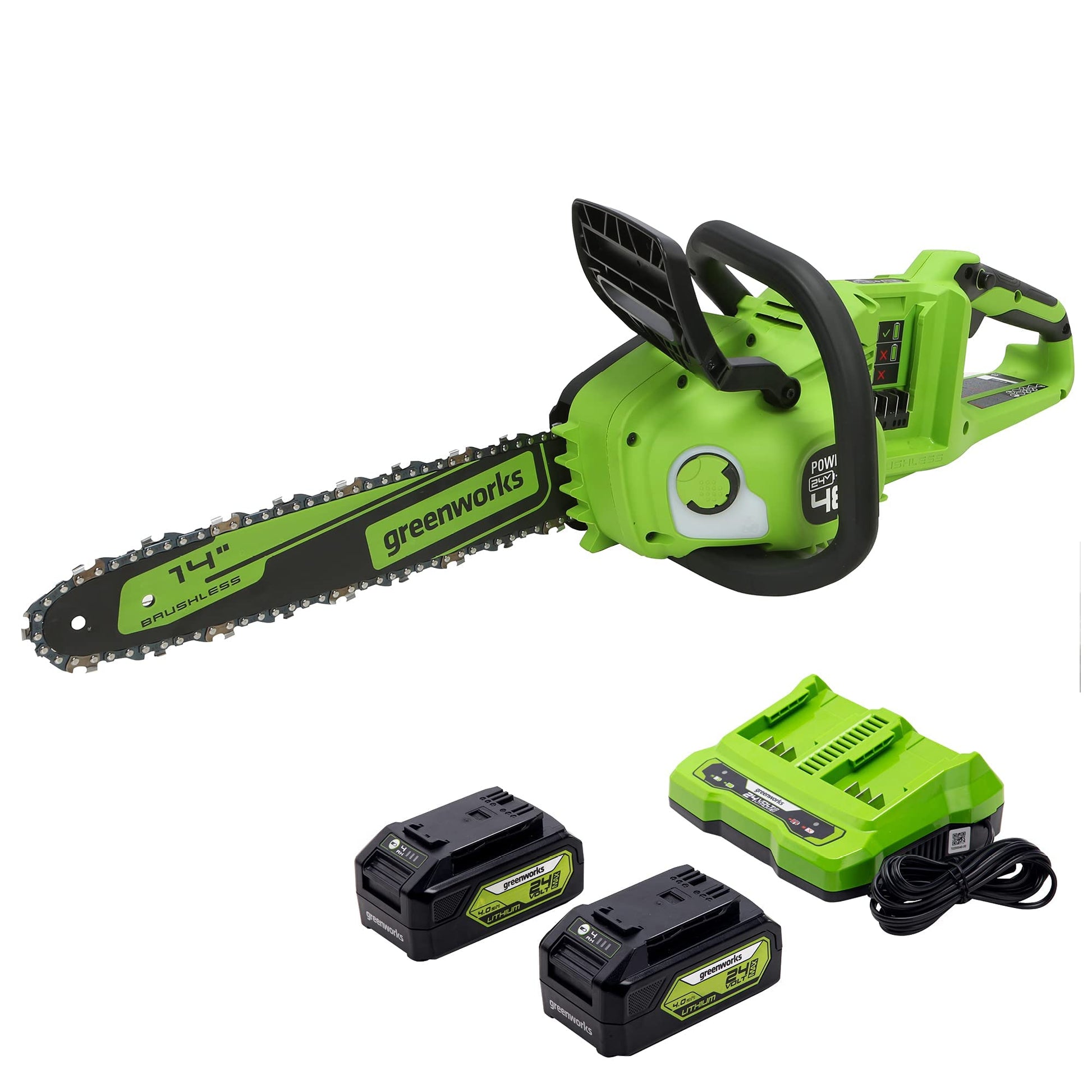 Details: Greenworks 2 x 24V (48V) 14-Inch Brushless Chainsaw, (2) 4.0Ah USB Batteries and Dual Port Charger, equipped with 14'' CHAIN AND BAR;and get up to 150 cuts on 4x4 lumber on a single charge; with brushless motor and provides more power, longer runtimes, quiet operation, and extended motor life; automatic oiler; easy adjustment chain tensioning.2 pcs 4.0 ah batteries ensure longer runtime.