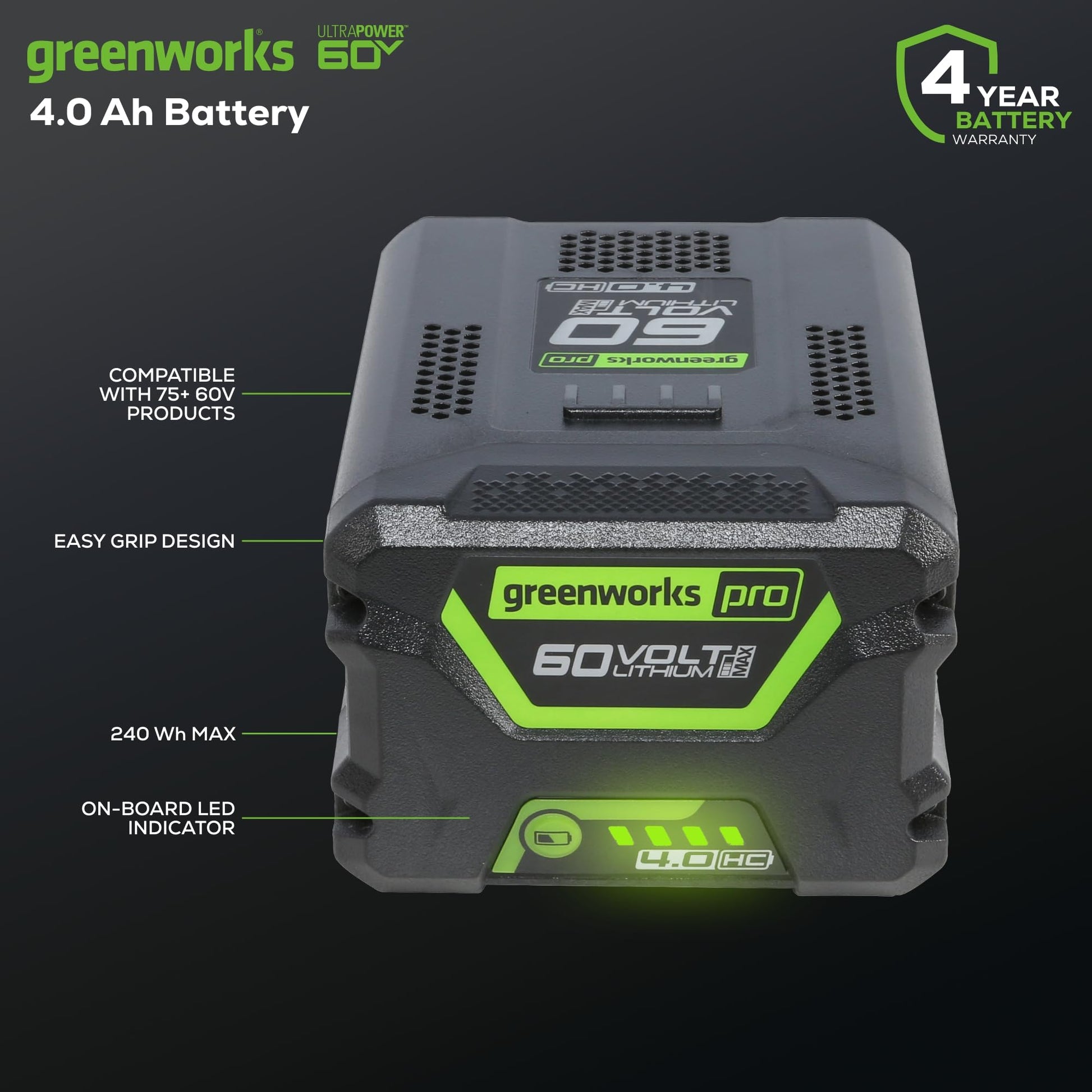 - Greenworks Pro 60V high current battery provides the power you need for maximum performance.