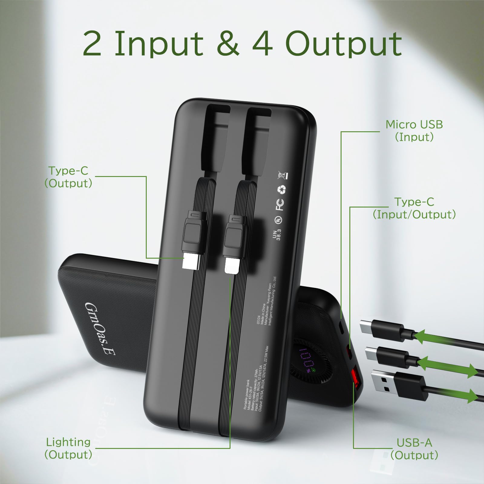 - 4 Outputs and 2 Inputs:GrnOas.E power bank builts in 2 output cables and another 2 outputs(usb a,usb c),Charging for 4 Devices Simultaneously.It also builts in 2 inputs (usb c input and micro input), which you can use any one of them to recharge the external battery pack conveniently.