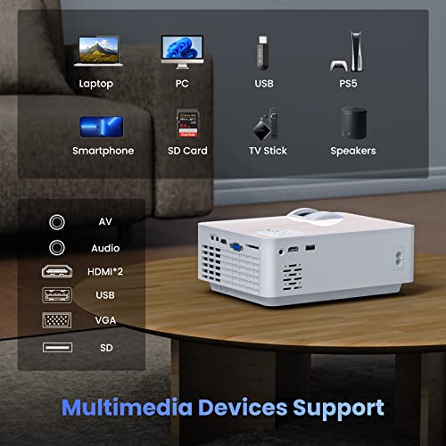 - [Flexible compatibility] The HDMI, VGA, USB and SD ports of the outdoor movie projector makes it compatible with a variety of electronic devices, including smartphones, laptops, tablets, USB flash drives, game consoles, media players, and more. Before purchasing an HDMI adapter for phone connection, please inquire if the cable is compatible with your device! The projector with bluetooth is perfect for home entertainment, backyard, gaming, yoga, or party