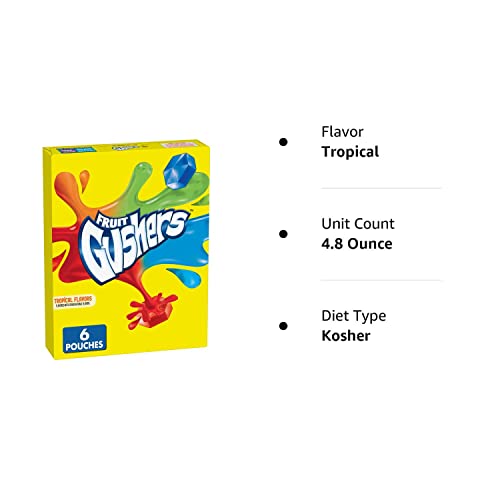 Details: Gushers Fruit Flavored Snacks are bursting with fun. Gushers have a juicy center that bursts open with delicious fruity flavored liquid. Enjoy delicious Gushers Fruit Flavored Snacks, filled with Tropical flavors. With wild flavors and colors, the possibilities for fun are endless. You've finally found the perfect after-school snack that's a win for you and your kids. Packaged for on-the-go convenience, Gushers Fruit Flavored Snack pouches are the perfect addition to your pantry and grocery routine and a snack every member of the family will love. These tasty treats are made without gluten and gelatin. Contains six fruit flavored snack pouches in total. .