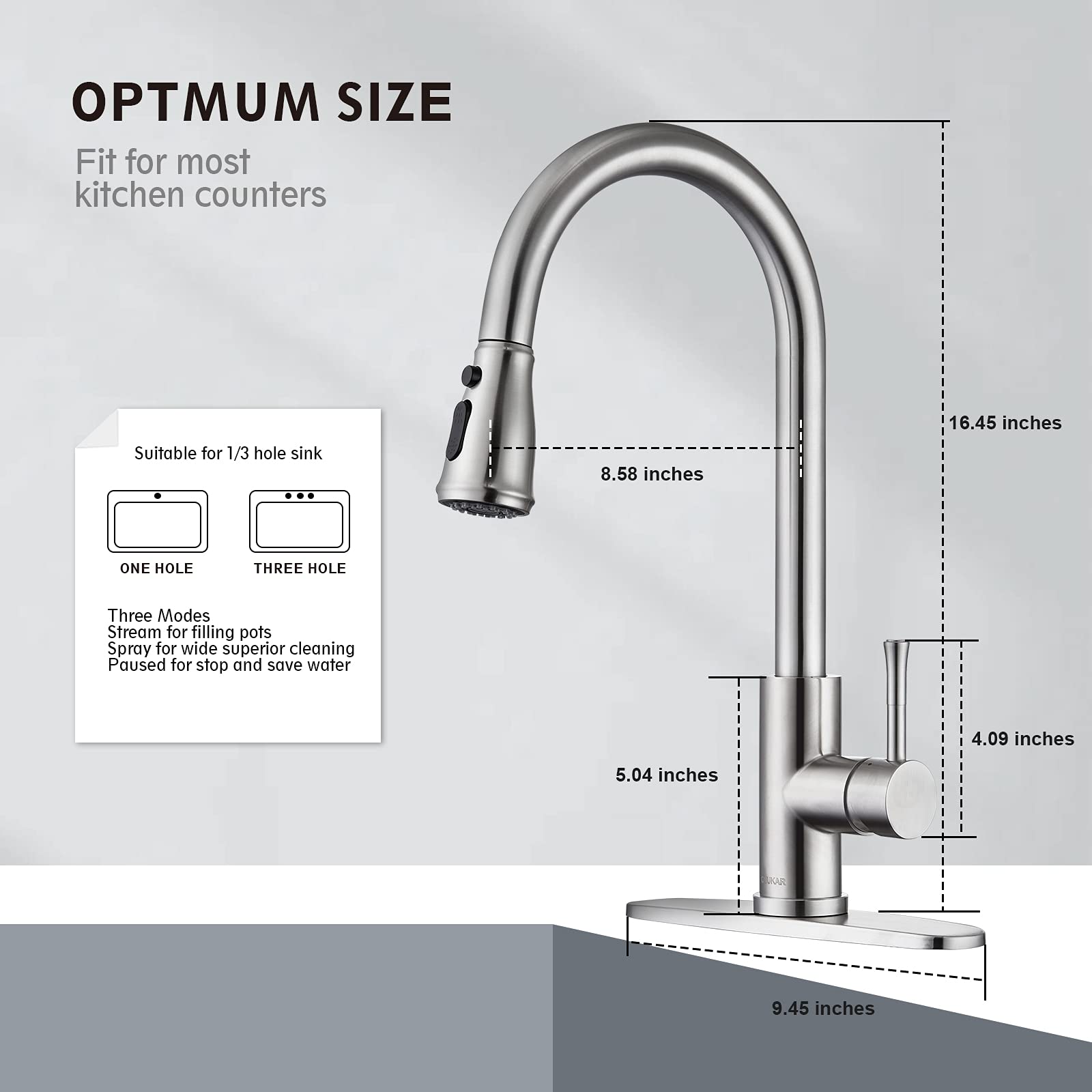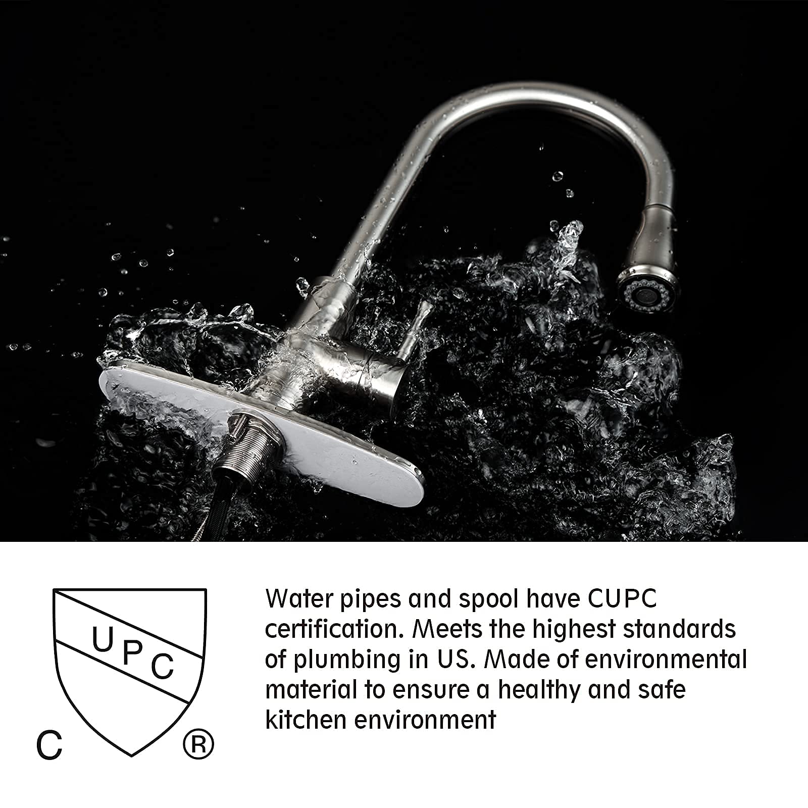 - EASY TO INSTALL AND MAINTENANCE: Compatible with standard 1 or 3 hole kitchen sinks, installing it is easy thanks to a connecting system that only required simple tools. You can DIY your installation without a plumber to save money and time.Keeping your faucet looking great and free from dirt and rust, we recommend cleaning it with a soft cloth on a daily basis.