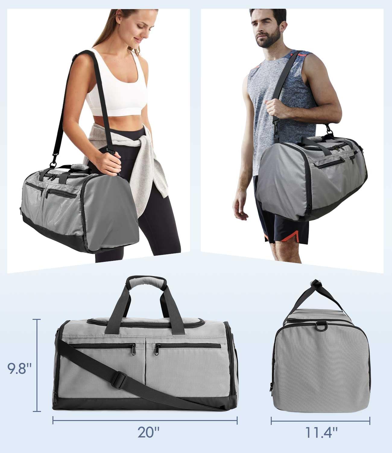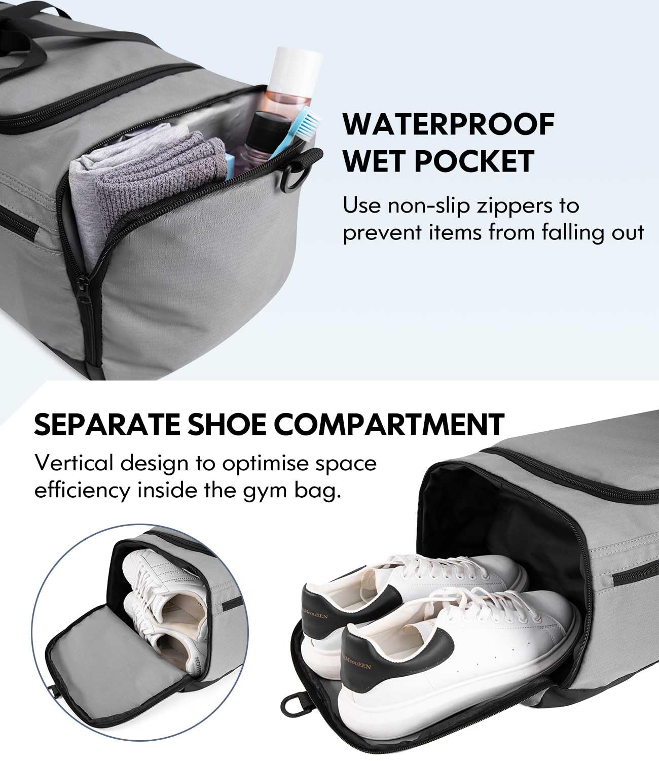 - VERTICAL SHOE & WET POUCH - This mens gym bag features separate compartments for shoes and wet items. The wet section uses waterproof PVC lined and non-slip zippers to prevent your items from falling out. The shoe compartment is vertical to optimize space efficiency inside the gym bag, fits up to a men's size 12 shoe.