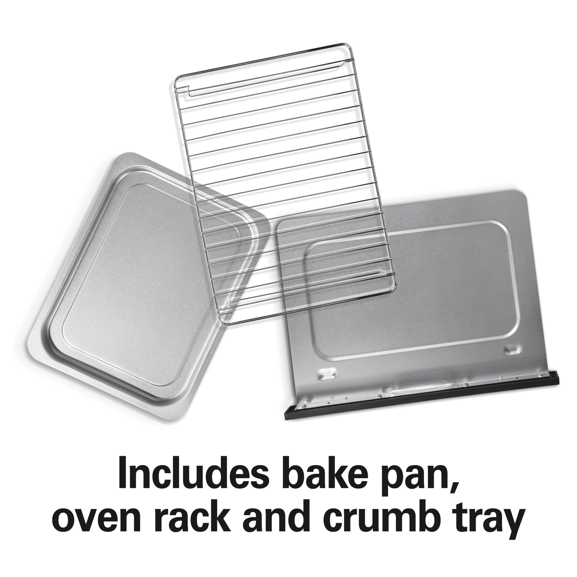 - ACCESSORIES INCLUDED: The oven comes with all the accessories you need to start cooking. You'll get a bake pan, oven rack and slide-out crumb tray.