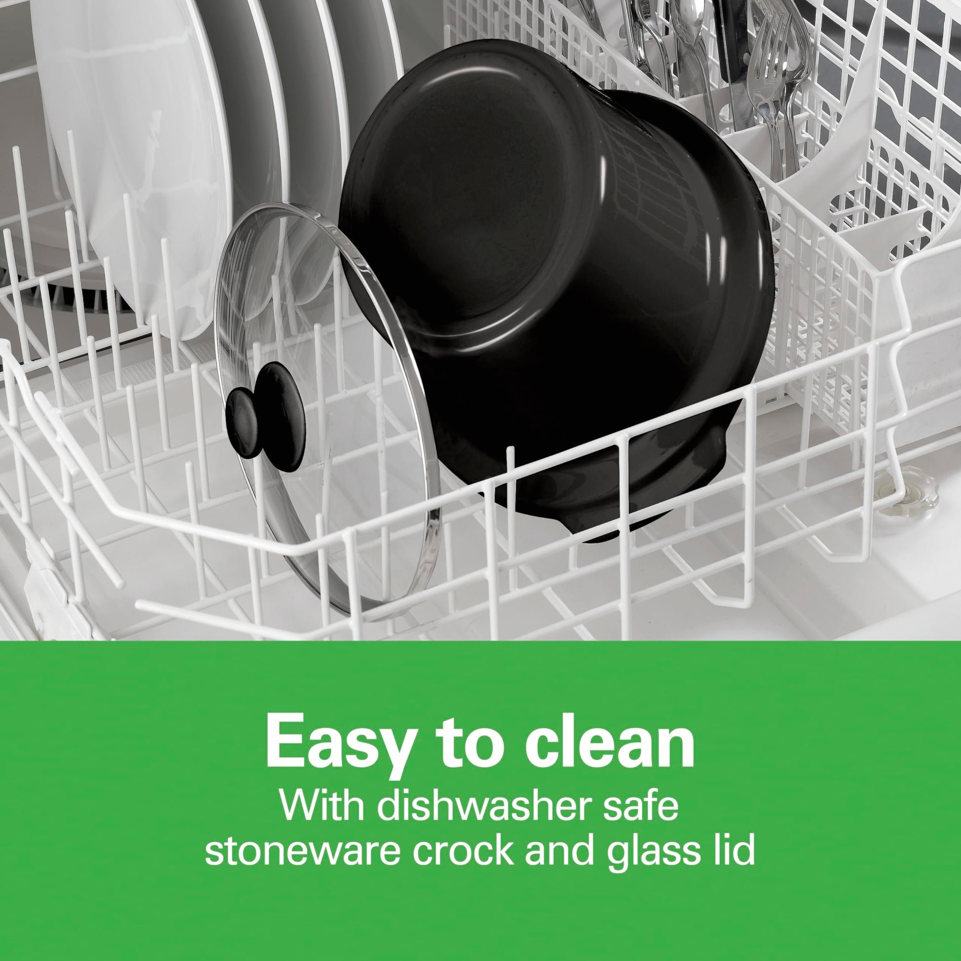 33463 Features: -Easy programmable cooking requires no watching or stirring. -3 Temperature control includes high, low and warm options. -Wrap around element for even heating. -Removable and dishwasher safe stoneware and lid. -Perfect for 6 pound chicken or 4 pound roast. Product Type: -Slow cooker. Shape: -Oval. Finish: -Silver and black. Removable Interior: -Yes. Operation Type: -Programmable. Dishwasher Safe: -Yes. Capacity: -6 Quarts. Dimensions: Overall Height - Top to Bottom: -9.2". Overall Width - Side to Side: -15.2". Overall Depth - Front to Back: -15.2". Overall Product Weight: -12.4 lbs.