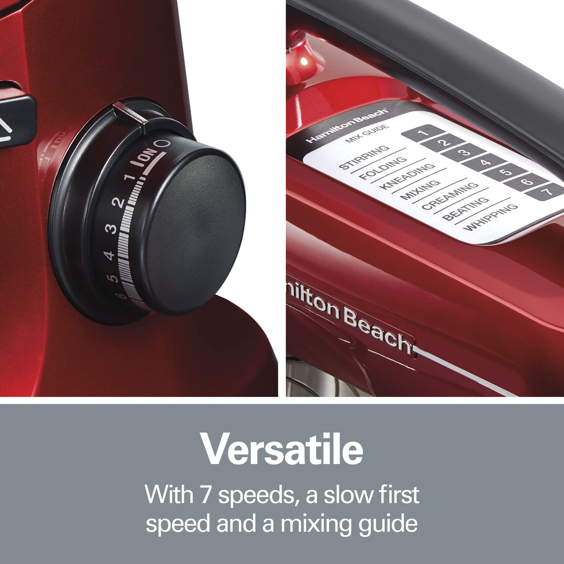 Hamilton Beach Electric Stand Mixer, 4 Quarts, Dough Hook, Flat Beater Attachments, Splash Guard 7 Speeds with Whisk, Red