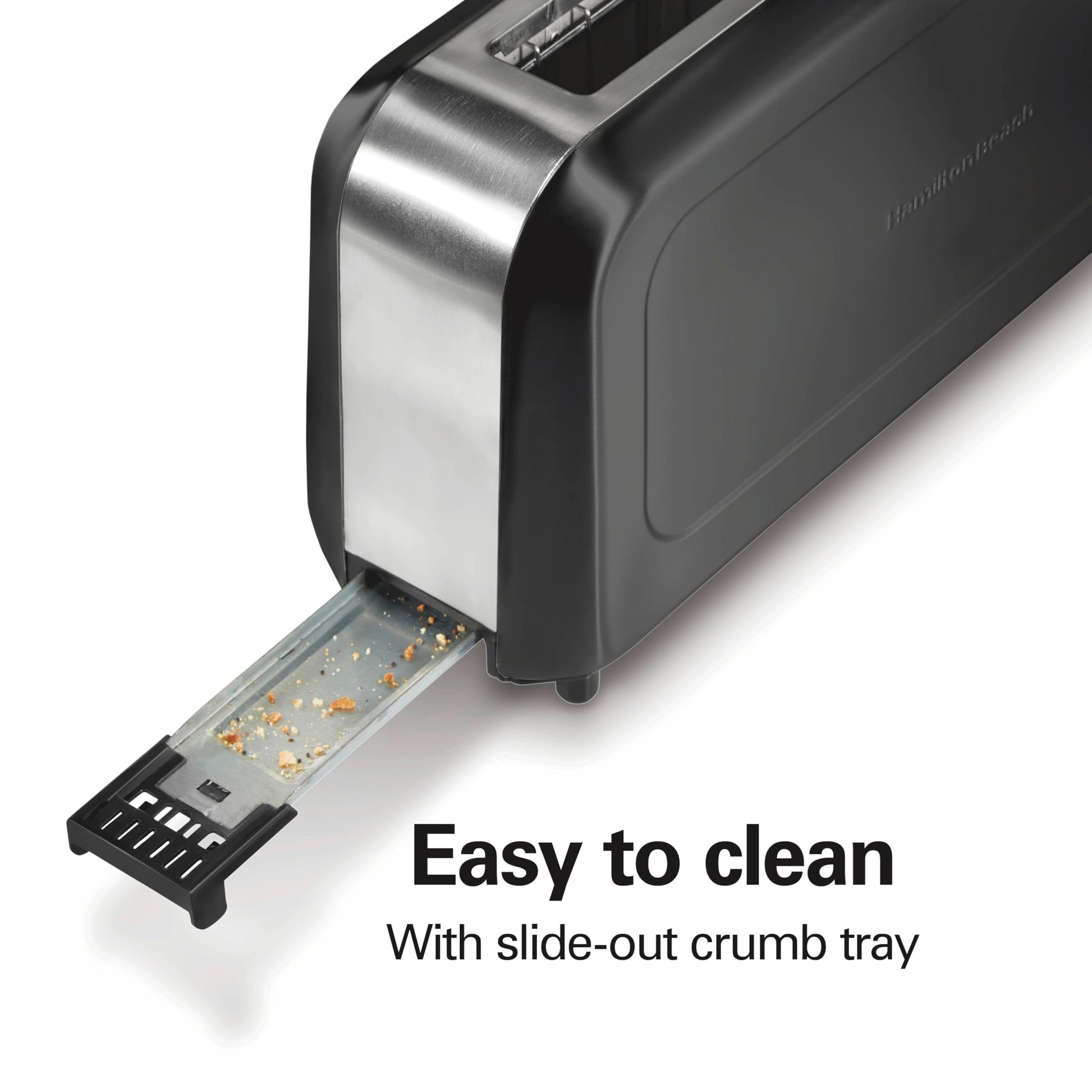 Details: The Hamilton Beach® Long-Slot Toaster has an extra-long, extra-wide 10" slot with self-centering bread guides to evenly brown 2 regular slices or 1 long slice of bread. The toaster has bagel and cancel buttons and a slide-out crumb tray.