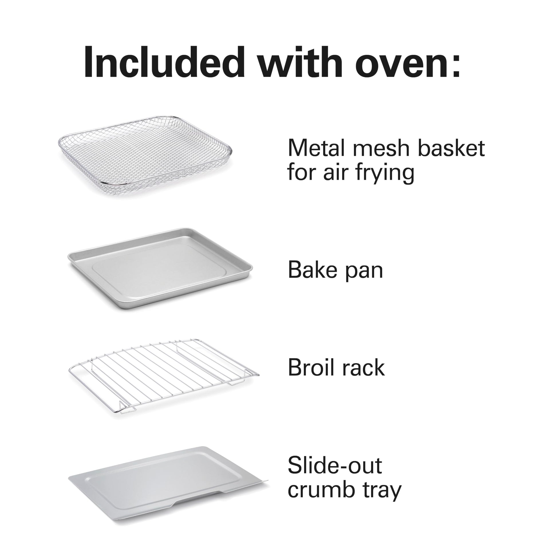 - INCLUDES METAL AIR-FRY BASKET, BAKE PAN AND BROIL RACK. The toaster oven air fryer combo oven comes with all the accessories you need to air fry, bake, broil, and toast, plus a slide-out crumb tray.
