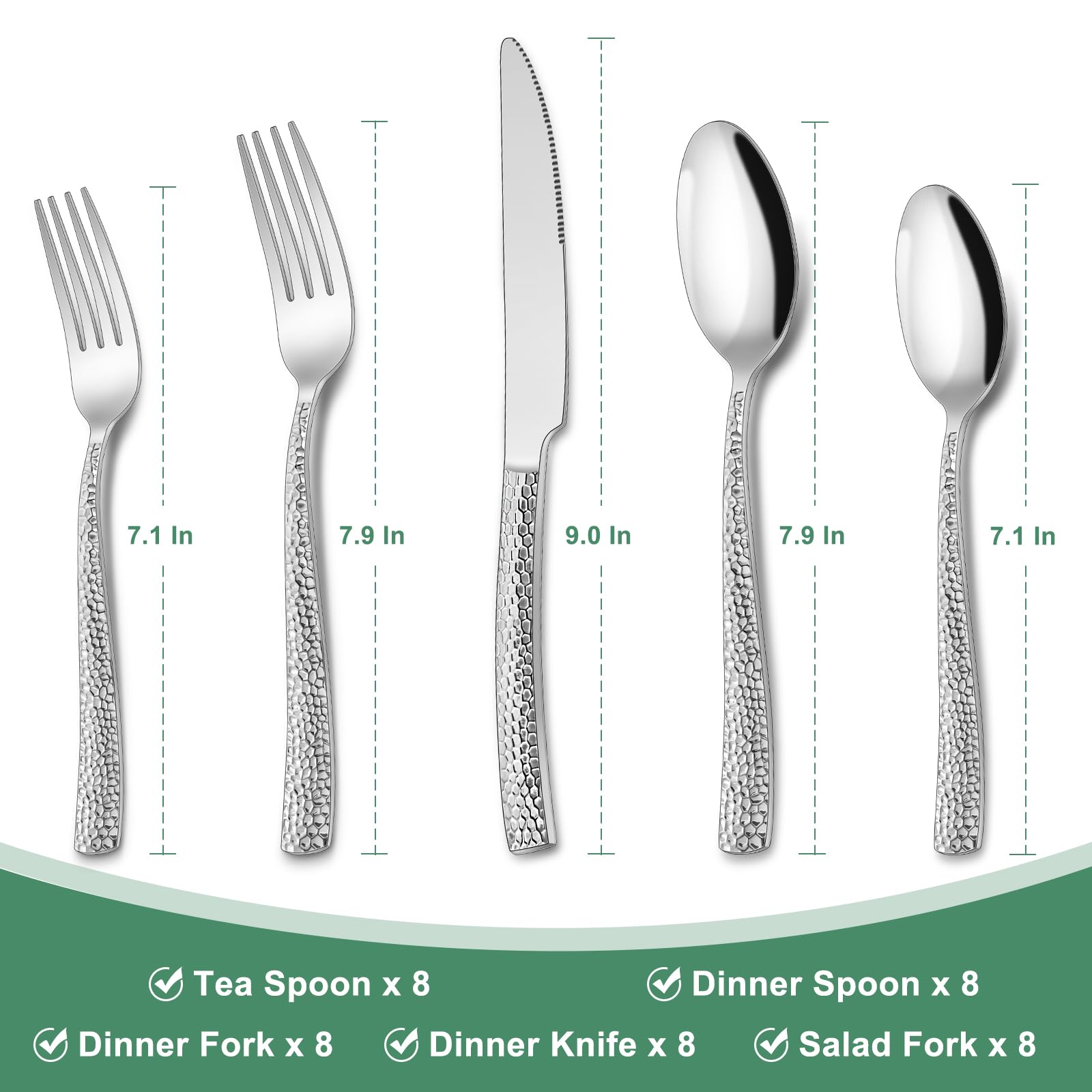 - PREMIUM 40-PIECE SILVERWARE SET FOR 8: This flatware set contains 8 dinner forks, 8 salad forks, 8 dinner spoons, 8 dessert spoons, 8 dinner knives. It’s the ideal set for home daily use, and also for restaurants, pubs, cafes, and hotels. This cutlery set also help your dinner full of design while having a party.