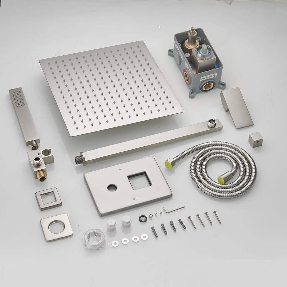 - INCLUDES: 12 inch Square rain shower head(304 stainless steel), handheld shower head(Metal), 13.7 inches shower arm(Metal), 1.5M shower hose(304 stainless steel),shower holder(Brass), water control valve(Brass)