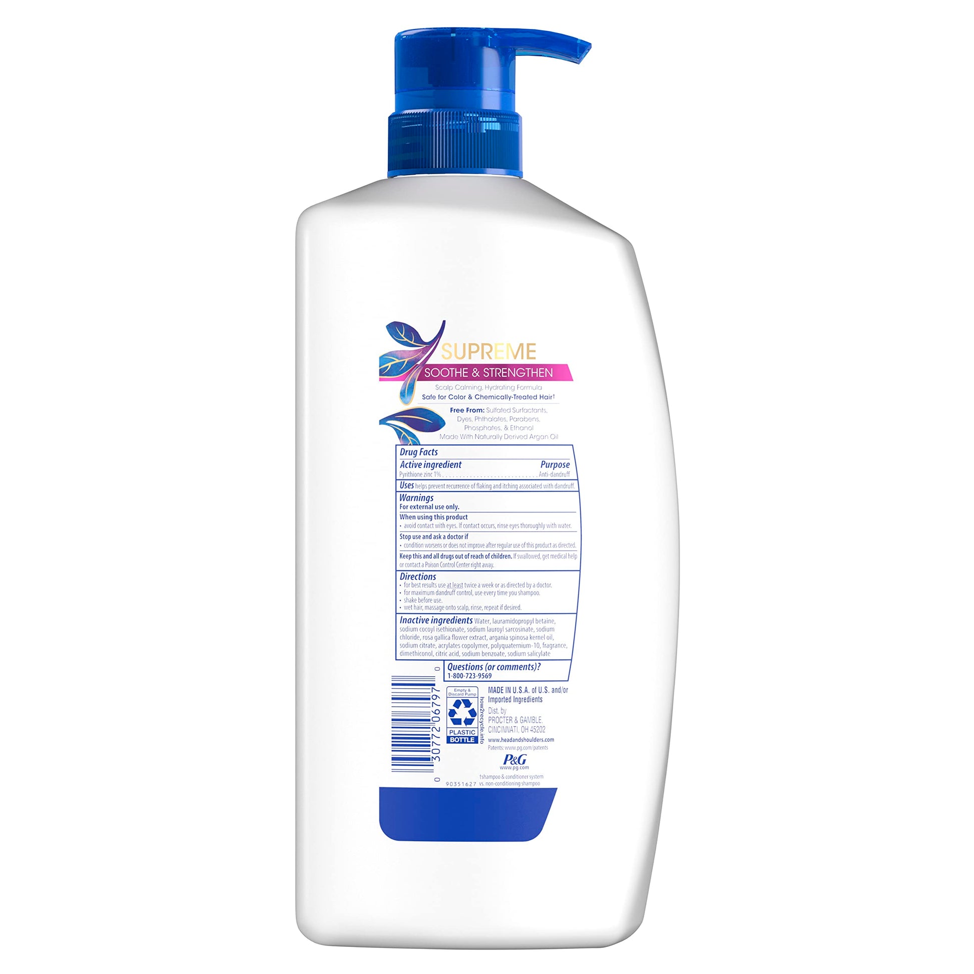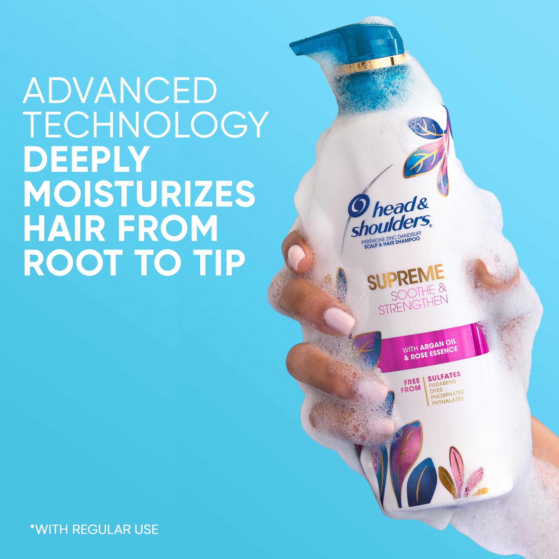 Details: Strengthen every strand from root to tip with Head & Shoulders Supreme Soothe & Strengthen Shampoo, brought to you by America's #1 dermatologist recommended brand. Our advanced technology offers a trifecta of amazing scalp care, hair care and a sulfate free formula that soothes itchy scalp*, scalp discomfort & irritation* to strengthen hair at the root. Discover healthy, vibrant hair today with Head and Shoulders Soothe & Strengthen Shampoo, made with rose essence and naturally derived argan oil. Free from sulfates, parabens, dyes, phosphates, phthalates, silicones and sulfated surfactants, this pH balanced anti-dandruff shampoo is designed for everyday use as part of your hair care routine, so you can get comfortable in all of your skin, including your scalp. *itch associated with dandruff, with regular use.