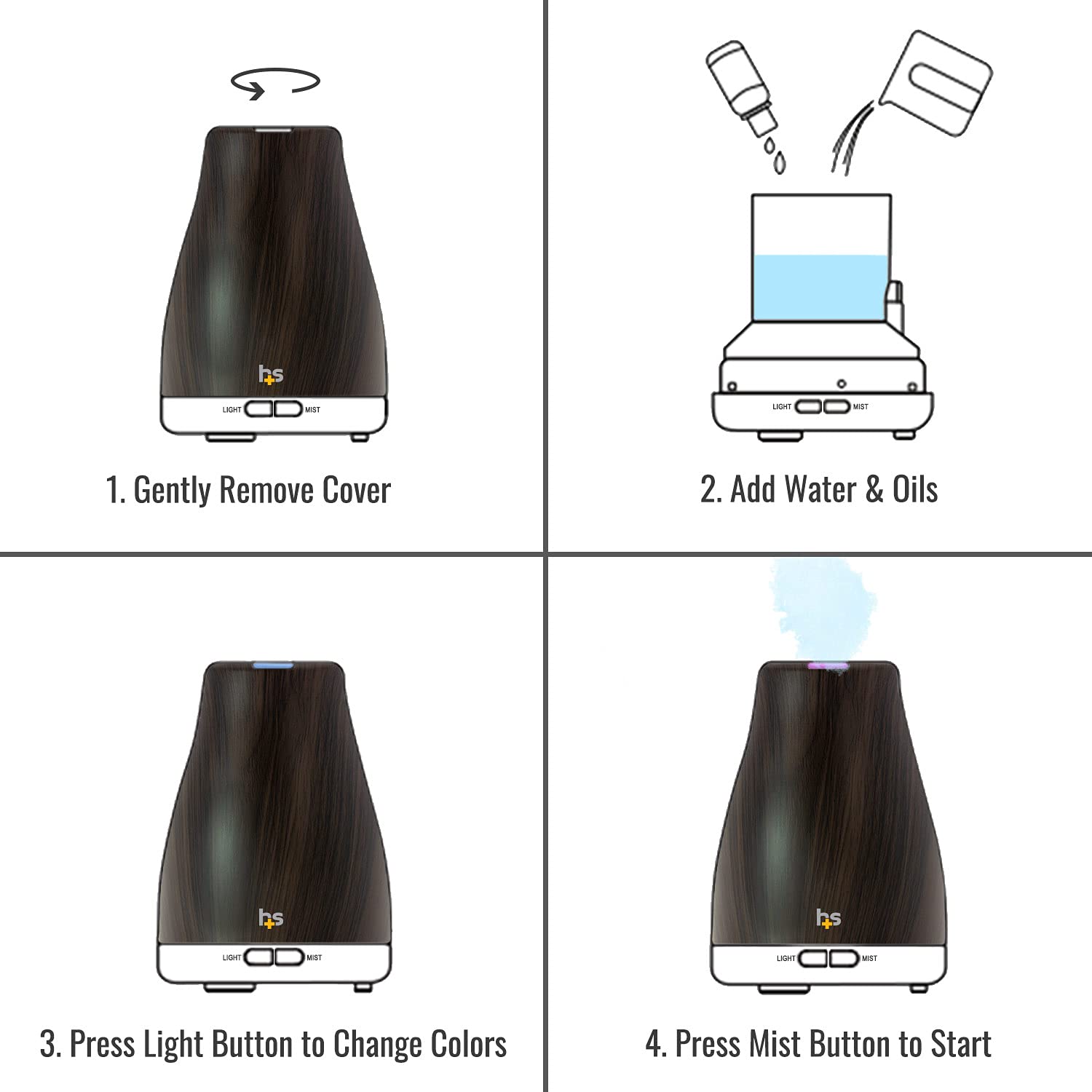 Details: This best-selling diffuser is perfect for cool mist humidification and diffusing essential oils in smaller rooms featuring a 150ml tank. It's perfect for adding scent to any room, relieving stress, and removing odors. Mist diffusers approx. 5-6 hours continuously. Simply remove the cover, add water, plug in and press the power button and let the diffuser do the rest. It will go to work in seconds and has a built-in auto shut-off mode, for peace of mind. These elegant diffusers also feature a subtle colored light, for even more environmental relaxation. You can program it to stay on your favorite color or cycle through 7 different colors during operation. Whether you start your day with an invigorating blend or finish with a relaxing mixture of essential oils, you are sure to love these new aroma therapy essential oil diffusers.
