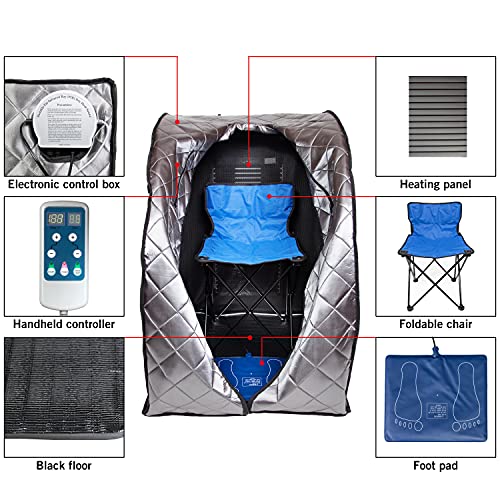 - CANVAS SEATING – Foldable chairs are included with this feature-rich sauna. It also comes with a comfortable collar, sewn-in pockets for books or devices, a relaxing foot pad, and a convenient, hand-held control.