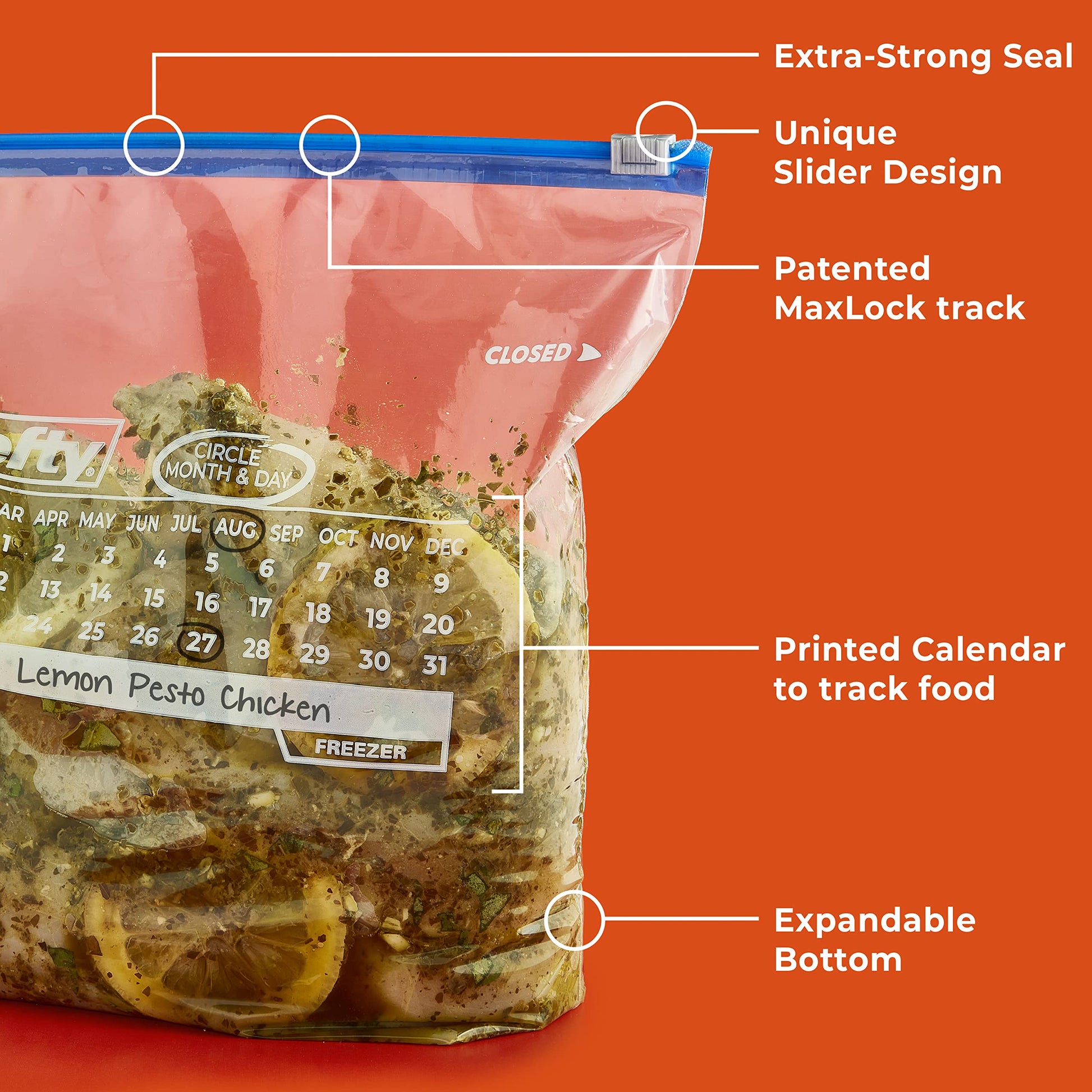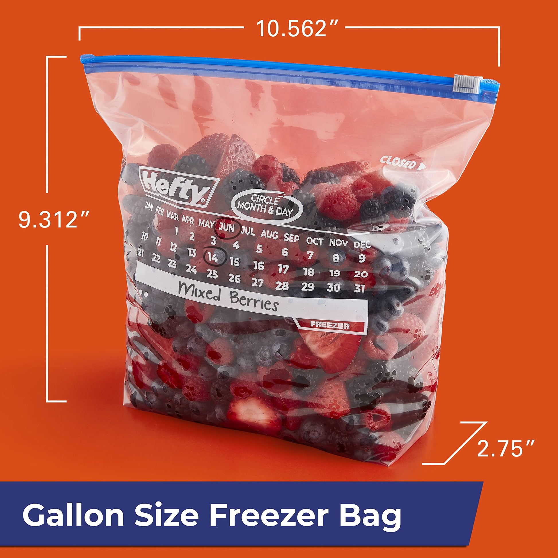 Details: Hefty Slider Freezer Calendar Bags provide a simple strategy for solving the mystery of what you’ve stored and for how long. Simply use the large write-on labels on these storage bags to label the contents, circle the month and date on the printed-on calendar, and store away! No more guesswork. The thicker plastic and extra-strong seal on these easy-to-use slider freezer bags help keep food fresh and protected from freezer burn. The patented, easy-to-use MaxLock track and Clicks-Closed feature lets you know when these BPA-free plastic bags for food storage are securely closed. Plus, the stand-and-fill expandable bottom makes it easy to load leftovers, meal prep, fruit, and more into these gallon slider bags with ease. Hefty's premium quality and super strength come with superior savings and a 100% satisfaction guarantee.