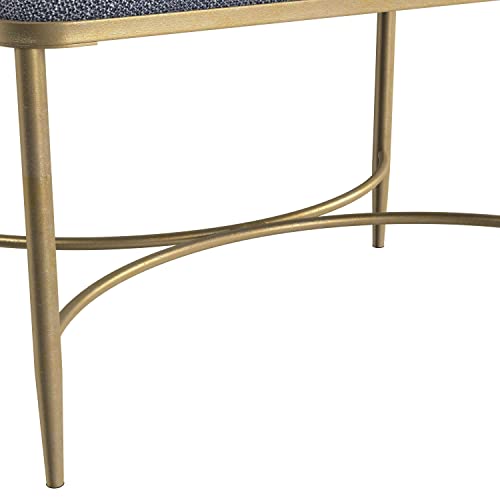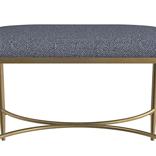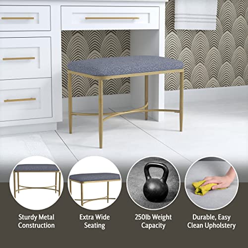 Details: Whether your vanity is for pampering or simply getting ready, you need a spacious surface to house your beauty products—and your vanity stool should be just as spacious as well as comfortable. With this Modern Vanity Stool, the perfect perch awaits. Constructed with a solid metal frame with tapered legs in a gold finish, the wide rectangular seat of this vanity stool covered in soft blue upholstery will make your morning routine your favorite time of day. And with its glam styling, it effortlessly adapts to any space or décor. Assembly required.
