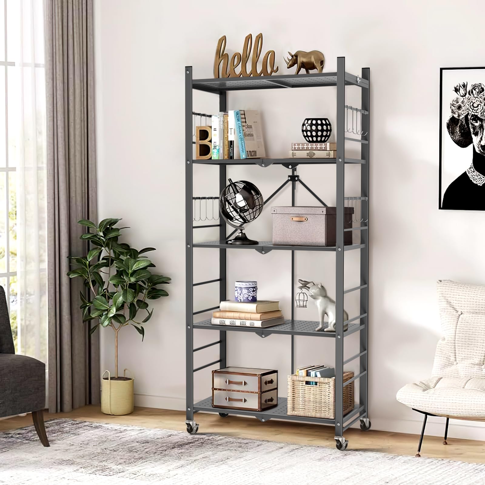 - What Will You Get: Order now, you will get 1* Himix 5-Tier Storage Folding Shelf; 20*Hooks; 4*Wheels; 4*Adjustable Feet; 600 Days no reason to return; 24* Hours customer service.