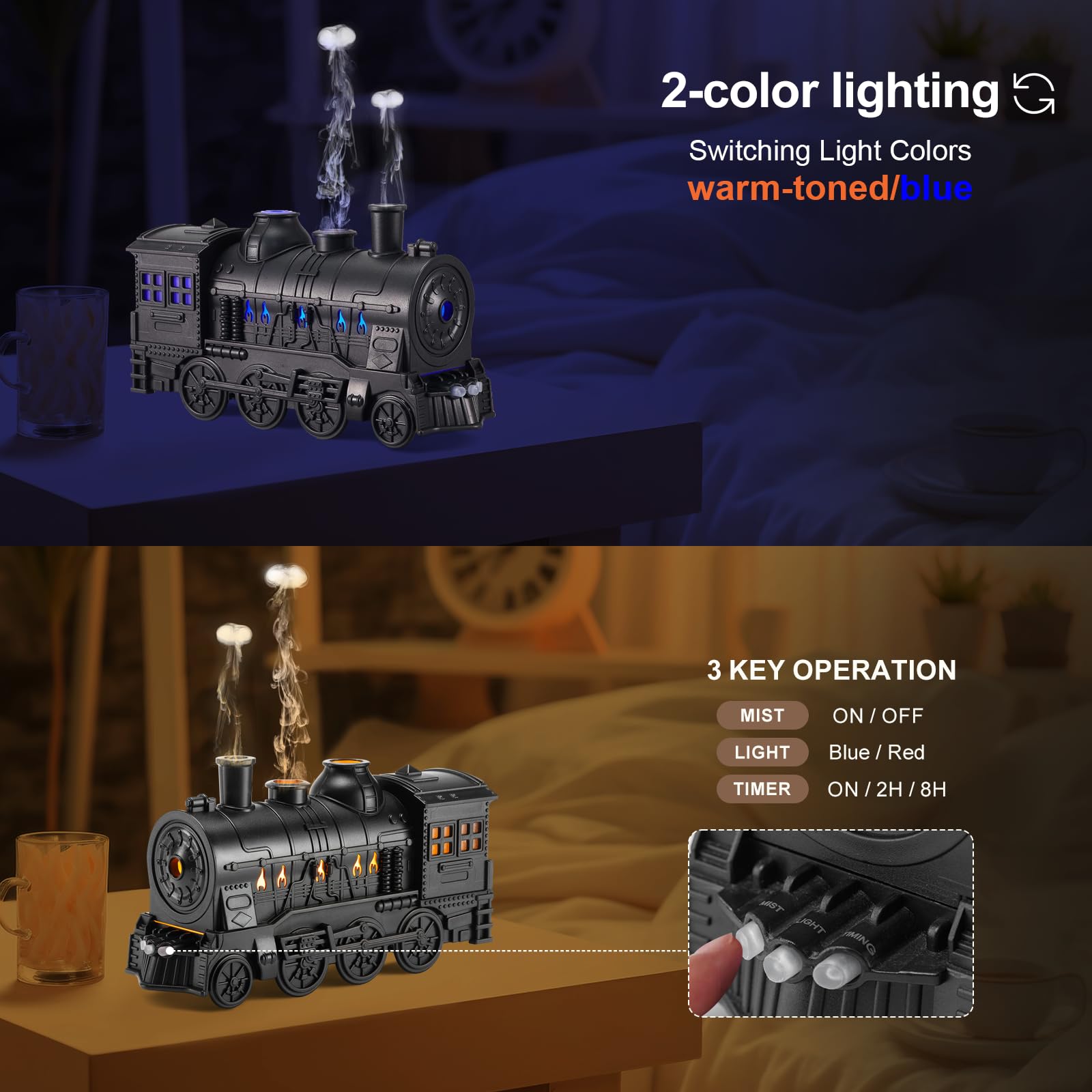 - 【2 Color Lights and 2 Spray Modes】Train diffuser has two colors of ambient light,cold blue and flame color, making the train-shaped diffuser more realistic,you want a bright and refreshing feeling or a comfortable and warm atmosphere,aromatherapy diffuser can satisfy you. Train diffuser has two spray modes,spitting circle mode and smoke mode.Two different feelings bring you more fun.Drop in essential oils and use at train diffuser for bedroom night to provide a peaceful sleeping environment, the small train diffuser makes you breathe comfortably and sleep better.