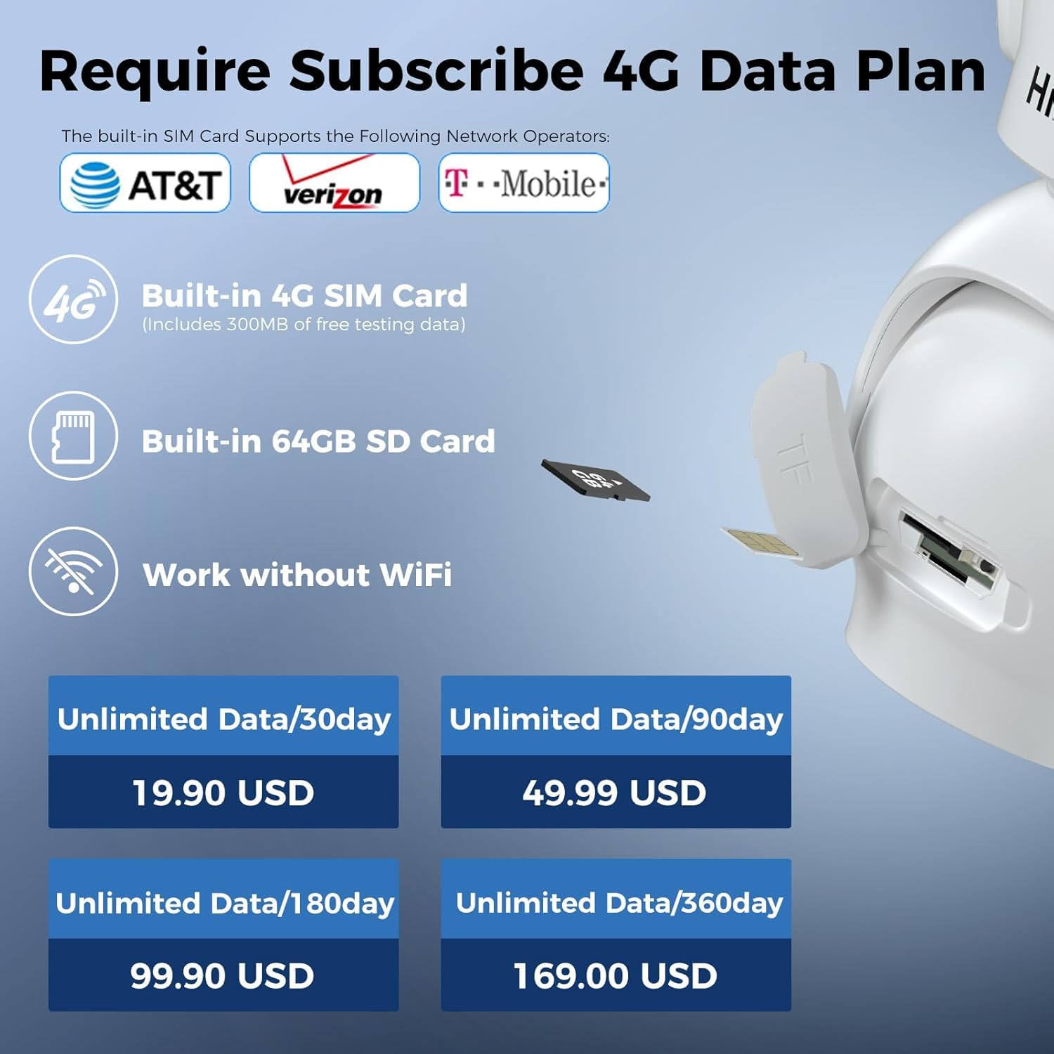 - 64GB SD Card Include & Built-in SIM Card Containing 300MB of Test Data: Our Cellular Security Camera comes with a 64GB SD card for local storage, ensuring worry-free data security. Additionally, a 300MB 4G data SIM card is Built-in for testing, No need to insert another SIM card. When the 300MB trial date runs out, you need to subscribe to a data plan through the app to continue using the camera. There are several flexible traffic packages to choose from, as low as $14.9 per month
