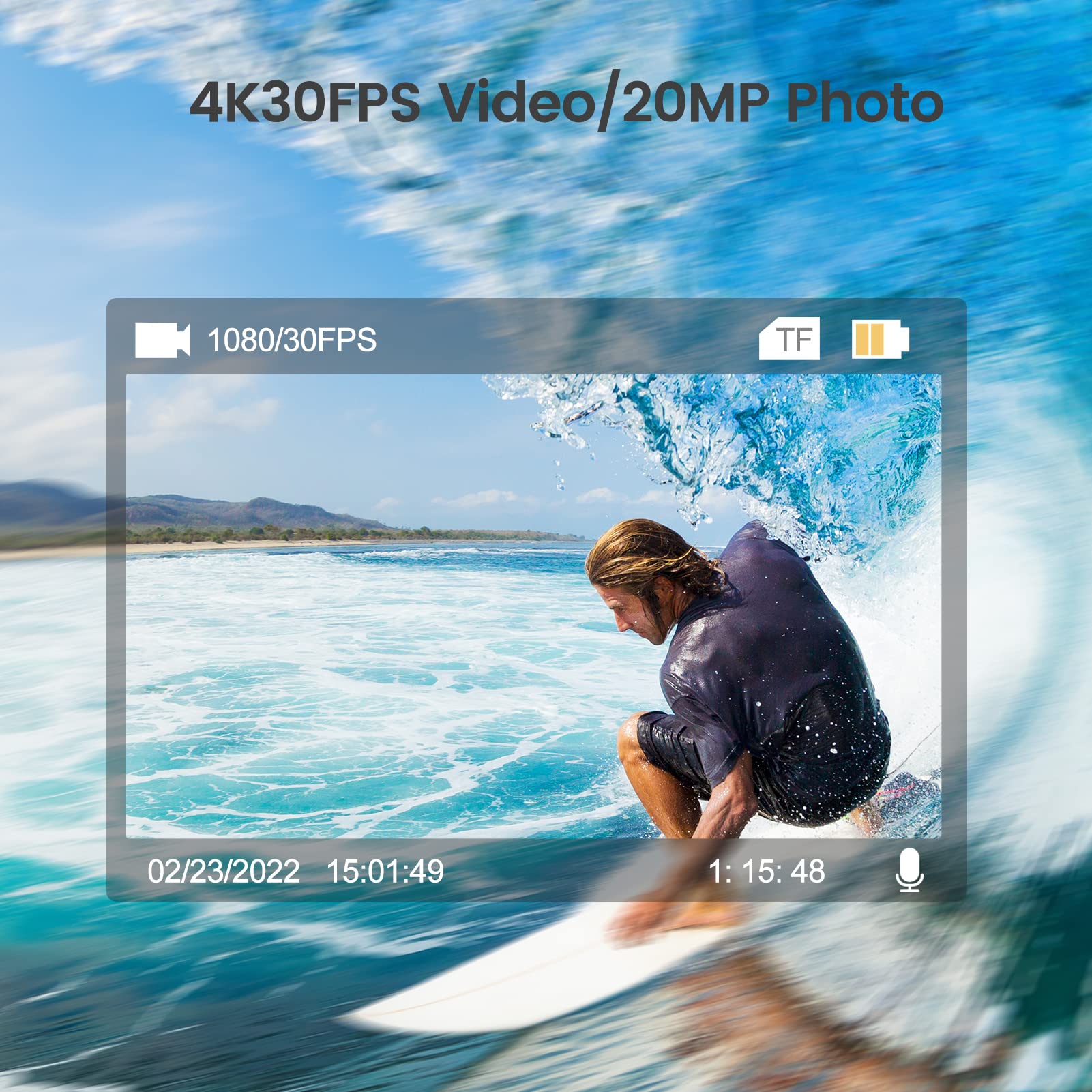 - Excellent Waterproof Performance: Underwater camera is designed to withstand extreme environments.Waterproof up to 100ft(30m) and match for any adventure such as cycling, hiking, driving, diving, surfing, skiing, snowboarding, skydiving etc.