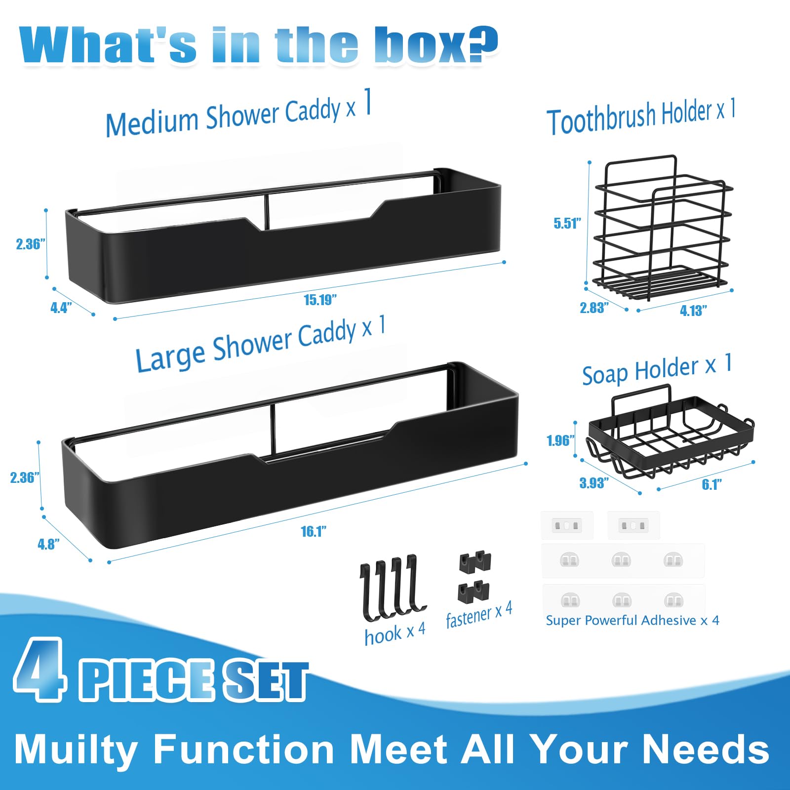 - 💦『4 Pack Extra-Large Capacity Shower Caddy Set』This shower organizer set provide abundant space, practical function, and cost-effective choice, allowing you to arrange various part in a different area to help you organize bathroom necessities. Our shower caddy set includes 2 big shower caddies, 1 soap holder, 1 toothbrush holder, 4 moveable hooks, and 4 super-powerful adhesives. It is an effective storage solution for small shower spaces to hold all your bathroom supplies.