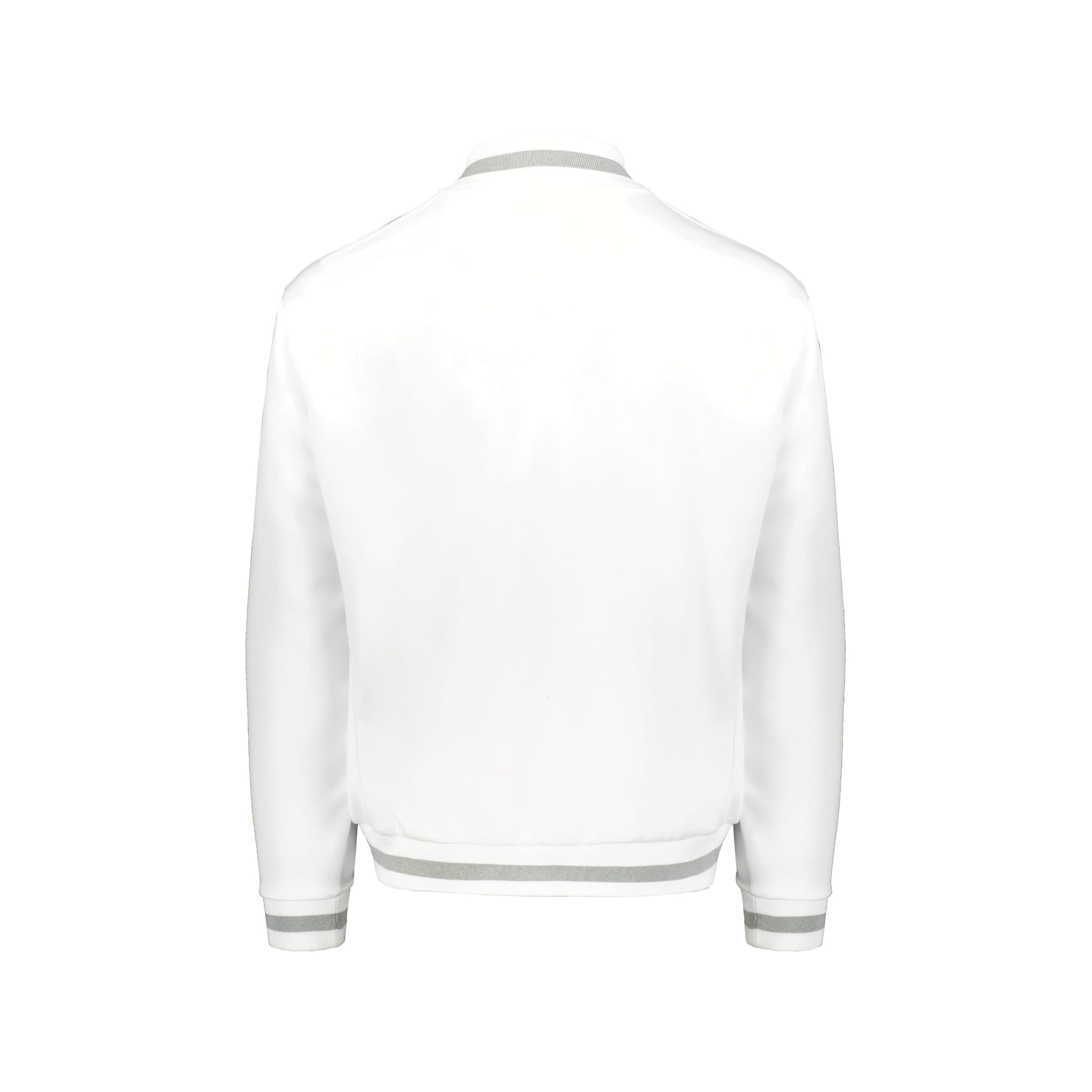 - Striped rib-knit collar, cuffs and bottom band