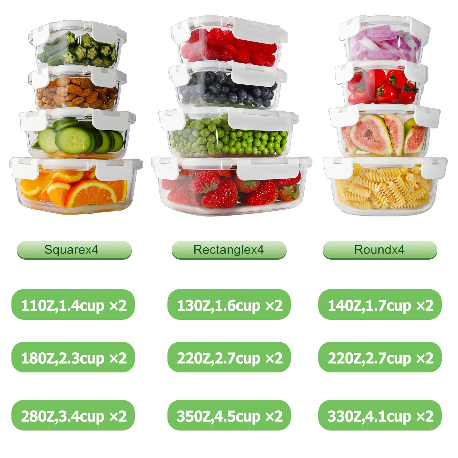 - [24 Pieces Glass Containers] HOMBERKING 24 pieces glass containers set included 3 types and 9 sizes for your different needs. Rectangle containers: 2x370ml(1.6 cups),1x630ml(2.7 cups),1x1040ml(4.5 cups), Square containers: 2x310ml(1.4 cups),1x530ml(2.3 cups),1x800ml(3.4 cups), Round containers: 2x390ml(1.7 cups),1x640ml(2.7 cups),1x970ml(4.1 cups).(Please allow 0.1-0.3 inch in differs due to manual measurements) Perfect for gym, leftovers, picnic, portion control, work lunches,travel and more.