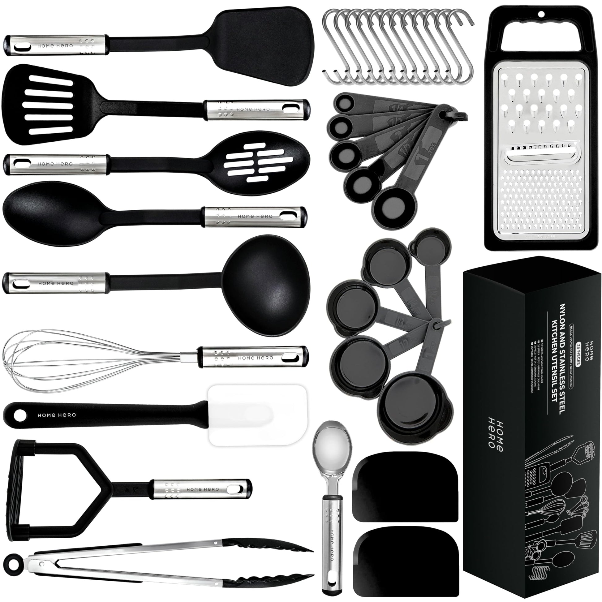- Worth the Investment - This all-in-one high quality black utensil set includes: 1 Ice Cream Spoon, 1 Spatula, 1 Grater, 1 Whisk, 1 Potato Masher, 1 Set of Tongs, 1 Solid Spoon, 1 Soup Ladle, 1 Slotted Turner, 1 Solid Turner, 1 Slotted Spoon, 5 Measuring Cups, 5 Measuring Spoons, 12 Hooks, 2 Dough Scrapers