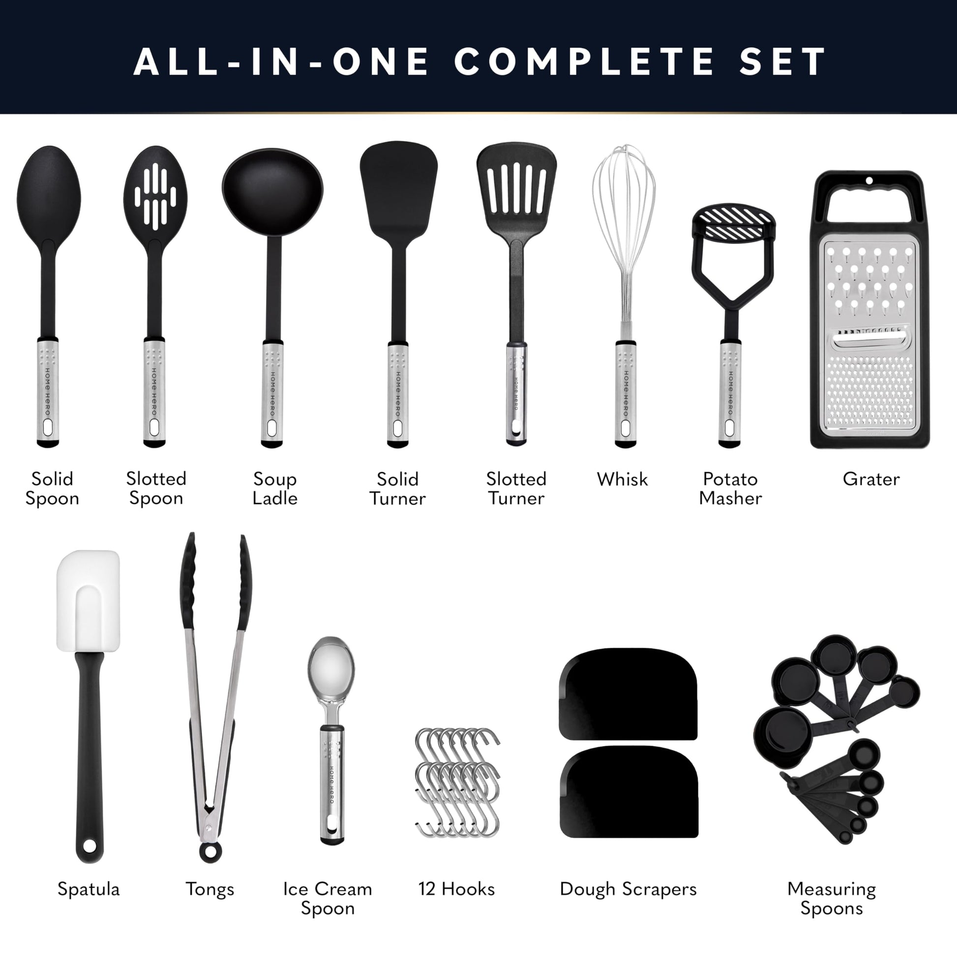 - Worth the Investment - This all-in-one high quality black utensil set includes: 1 Ice Cream Spoon, 1 Spatula, 1 Grater, 1 Whisk, 1 Potato Masher, 1 Set of Tongs, 1 Solid Spoon, 1 Soup Ladle, 1 Slotted Turner, 1 Solid Turner, 1 Slotted Spoon, 5 Measuring Cups, 5 Measuring Spoons, 12 Hooks, 2 Dough Scrapers