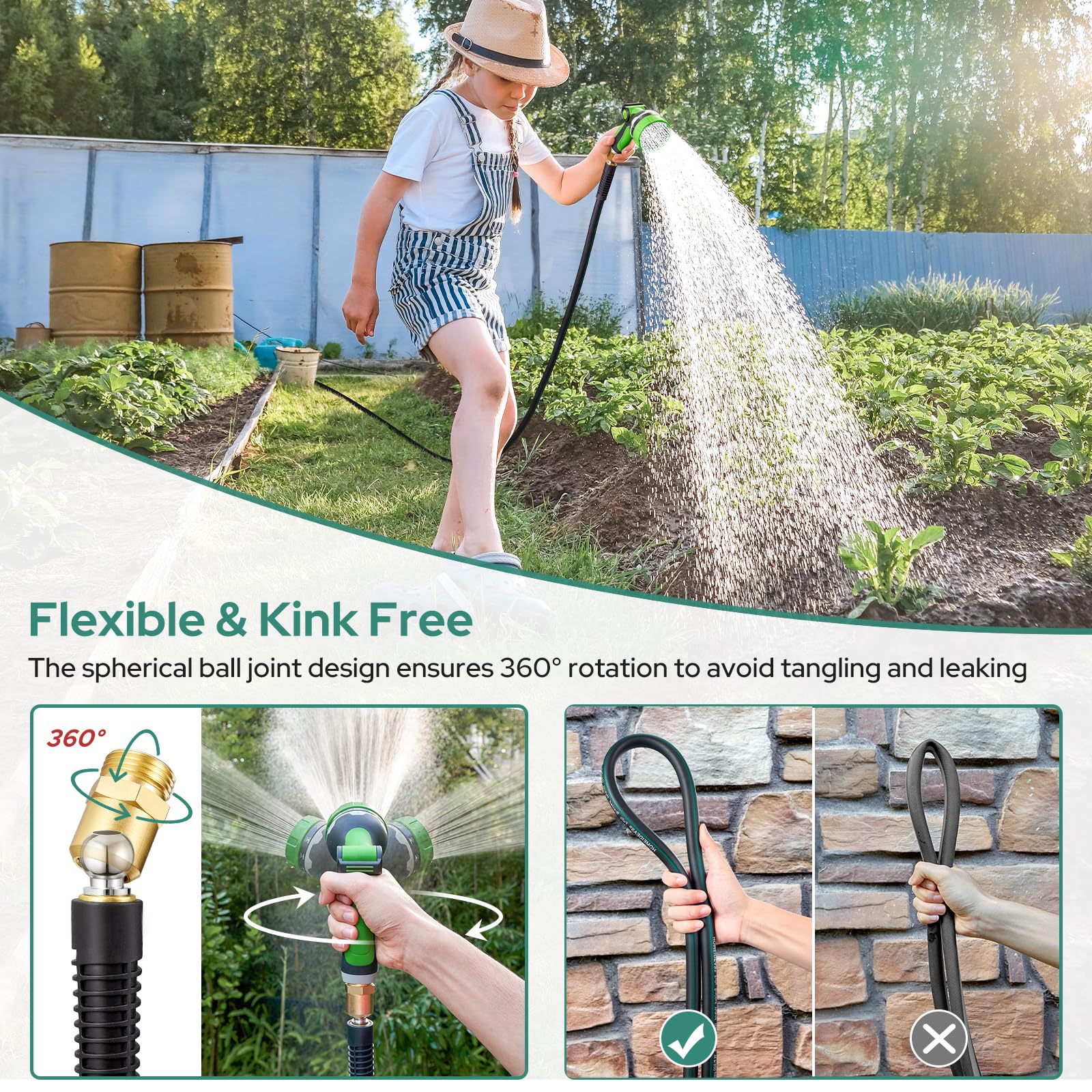 - Leak-proof and Kink-free Design: The spherical ball joint allows for 360° rotation, preventing tangling and reducing pressure to prevent leaks, ensuring a hassle-free watering experience.