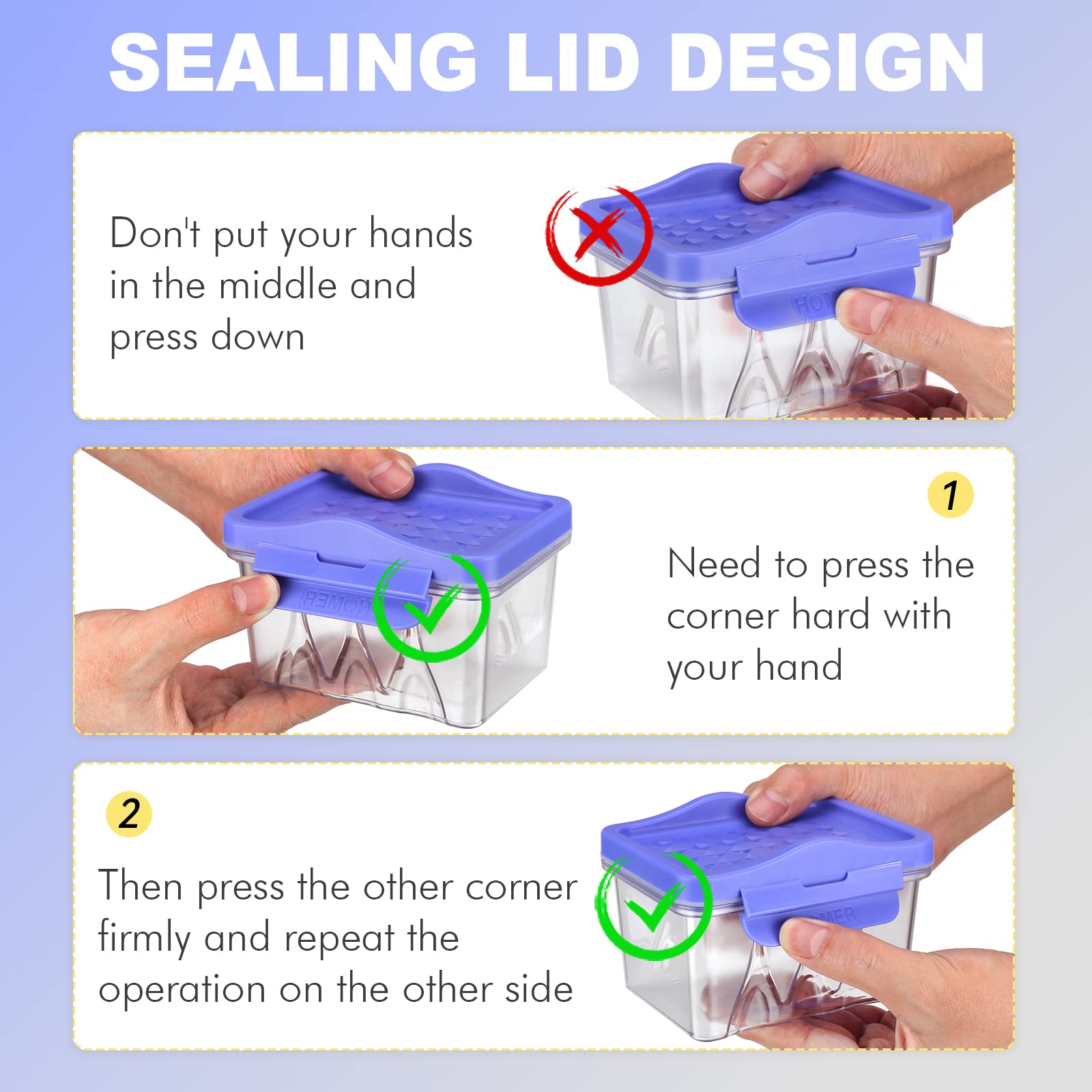 - ✔ AIRTIGHT SEALING - Airtight food storage containers with lids have been completely upgraded (the lid is easier to install), and a sealing flap and a silicone sealing ring are added to the lid to ensure that no air or water enters, providing maximum freshness and prolonged food storage. Tip: Please don't put your hand in the middle of your wings. You need to press one corner of the cover wing hard by hand until one corner of the cover wing is locked, and then press the other corner hard.