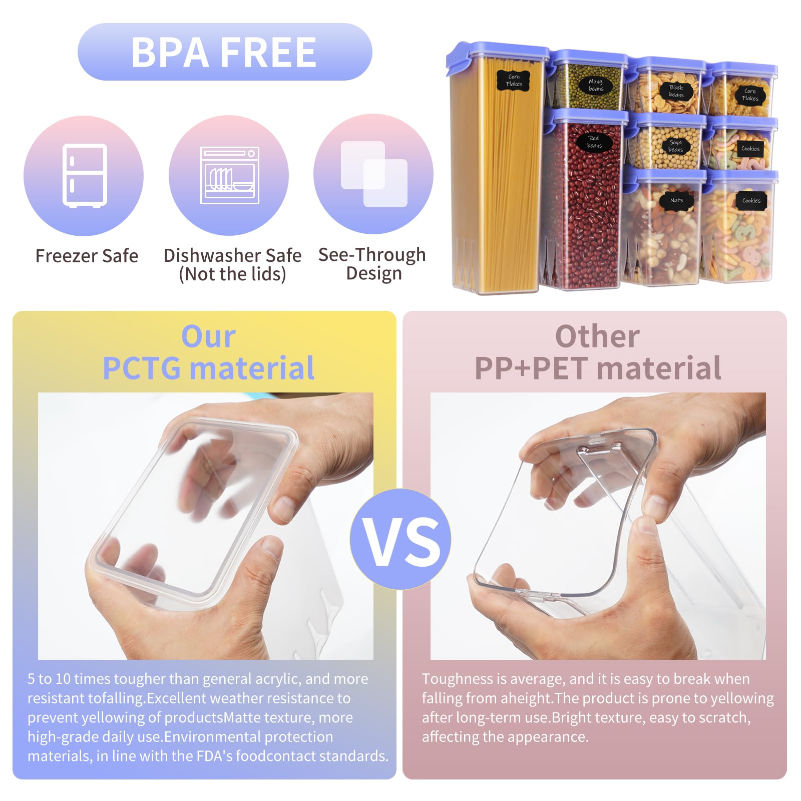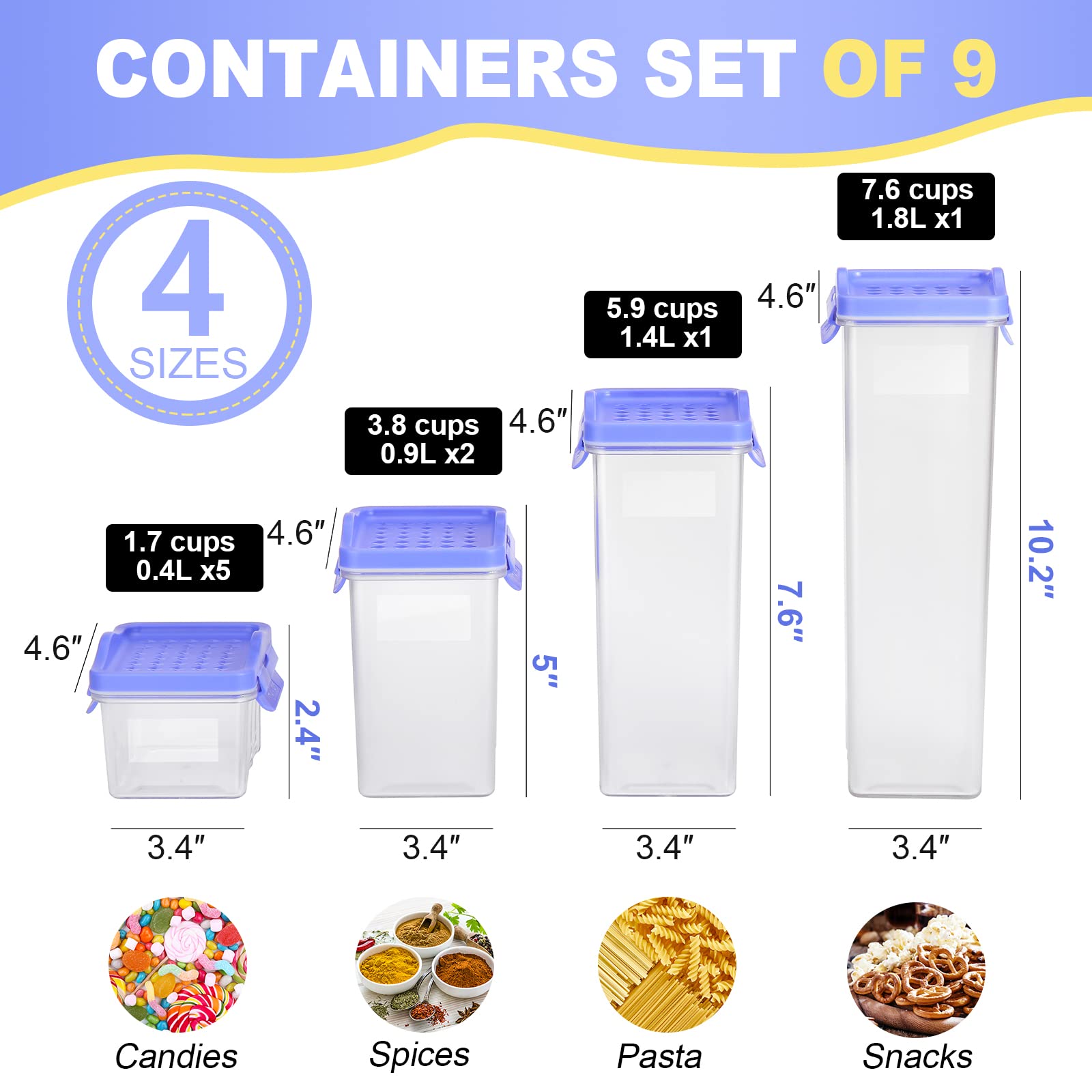- ✔ NO CONFUSION - Except 9 PCS kitchen organization with 9 PCS blue lids, you will also receive 40 pieces Labels and 1 Marker, which will help you never confuse flour with powdered sugar or baking powder with baking soda during the baking process. if you have any quality issue, 7* 24-hour one-to-one customer service. You don't need to worry about quality issues, we will provide you with a satisfactory reply.