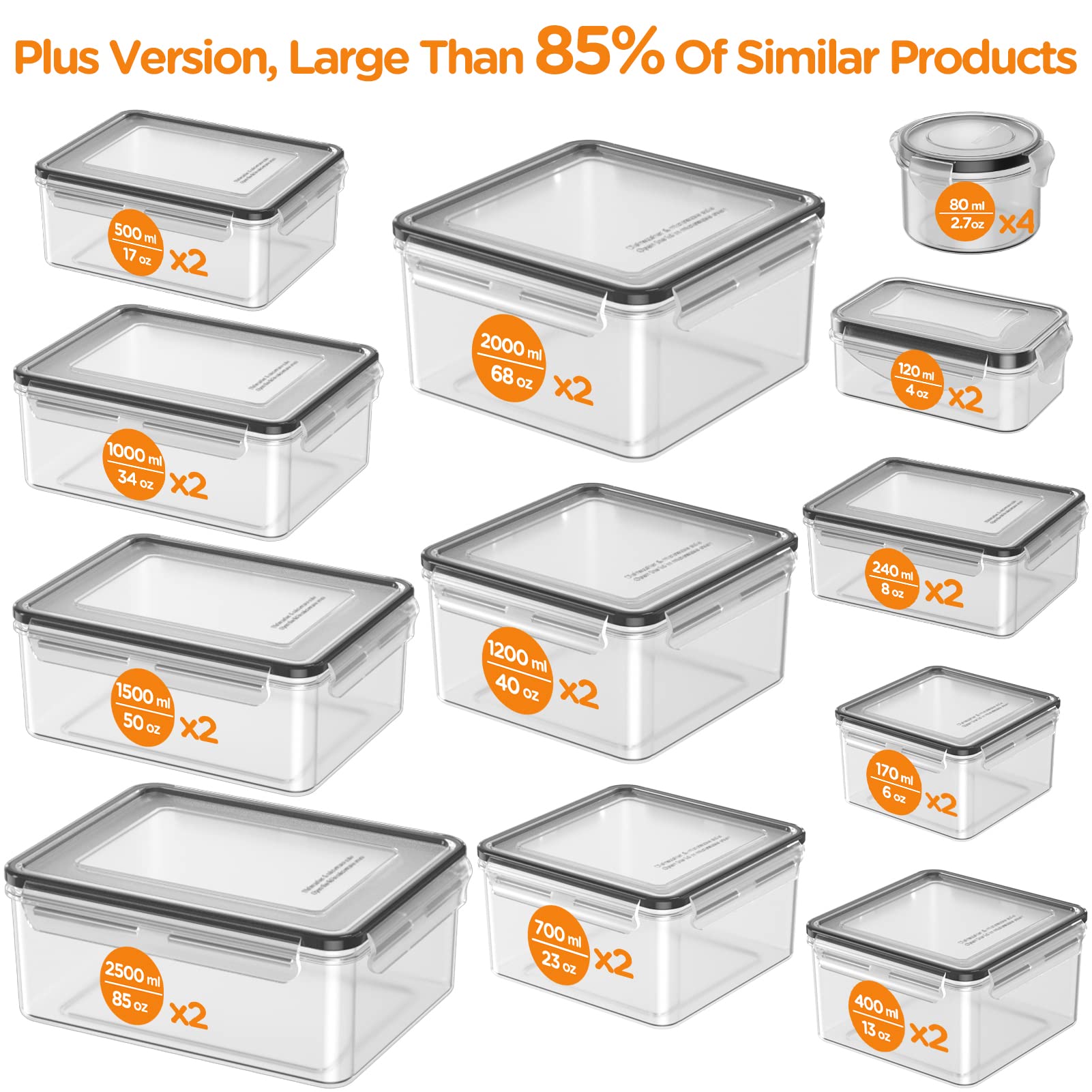 - 2.7 ~ 85 OZ - Set of 52 -- Includes 26 containers and 26 lids of varied sizes, and 3 pieces of Labels & 1 washable marker pen, To match different storage needs, This set includes 12 rectangular containers (2*85OZ, 2*50 oz, 2*34 oz, 2*17 oz, 2*8 oz, 2*4 oz), 10 square containers (2*68OZ, 2*40 oz, 2*23 oz, 2*13 oz, 2*6oz), and 4 round sauce boxes (2*2.7 oz).
