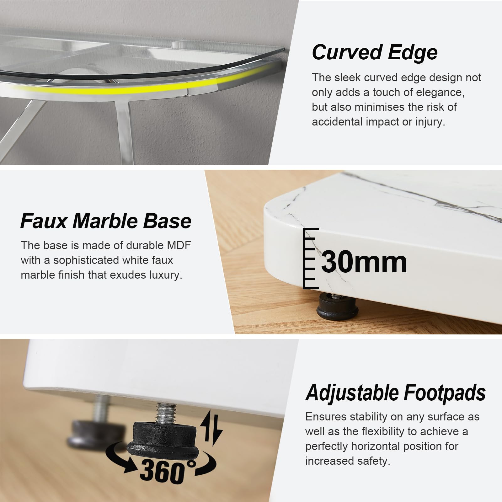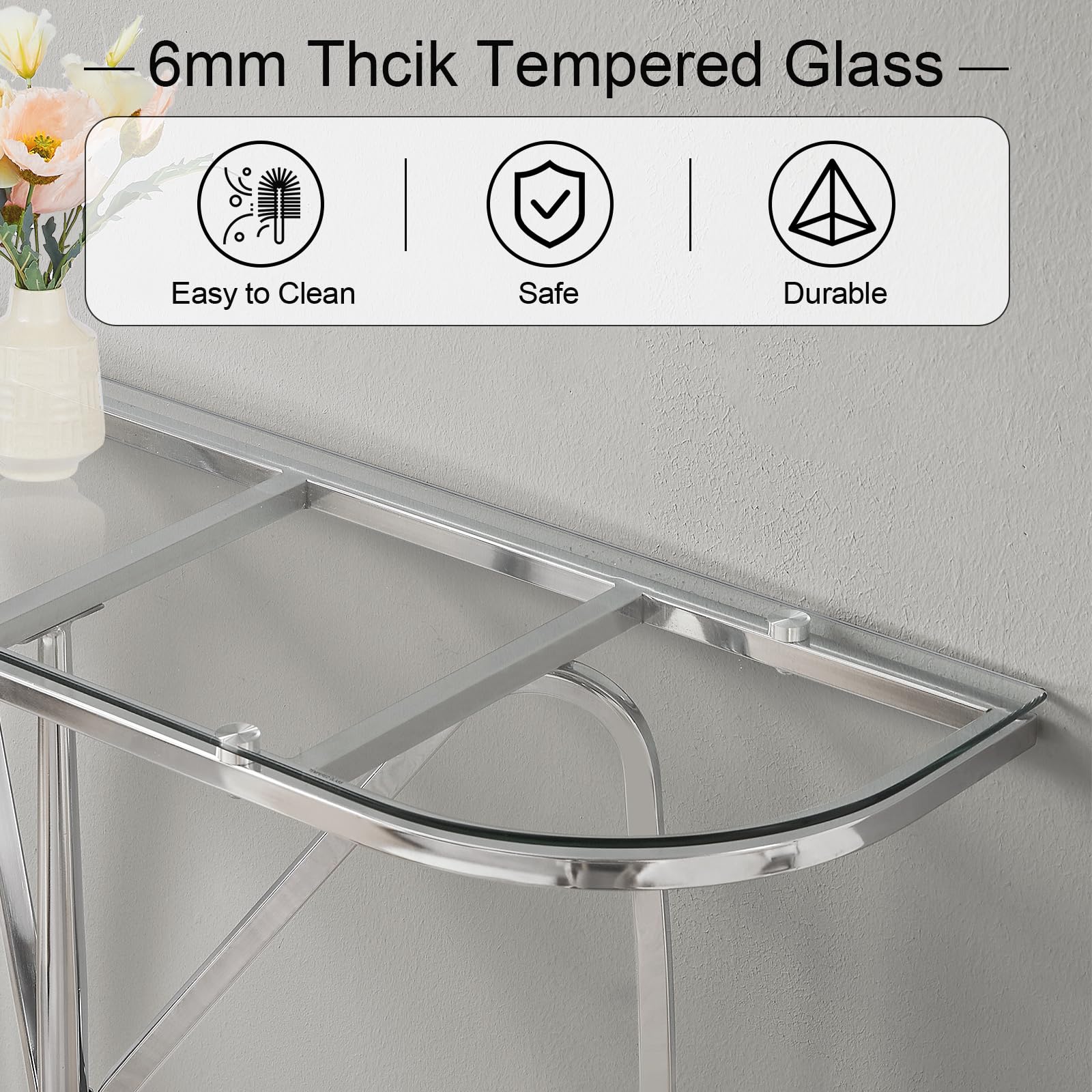 - 【Convenient maintenance】Our entryway table features 6 mm tempered glass tops that is not only easy to clean, but also but also more durable than regular glass. Simply wipe with a rag, you can removes dirt or stains effortlessly, leaving the table looking pristine. The frame chrome plating process ensures that the glass entryway table maintains its shiny luster, giving it an everlasting appeal.