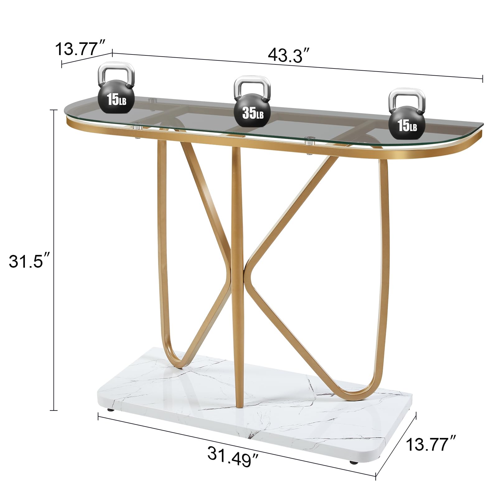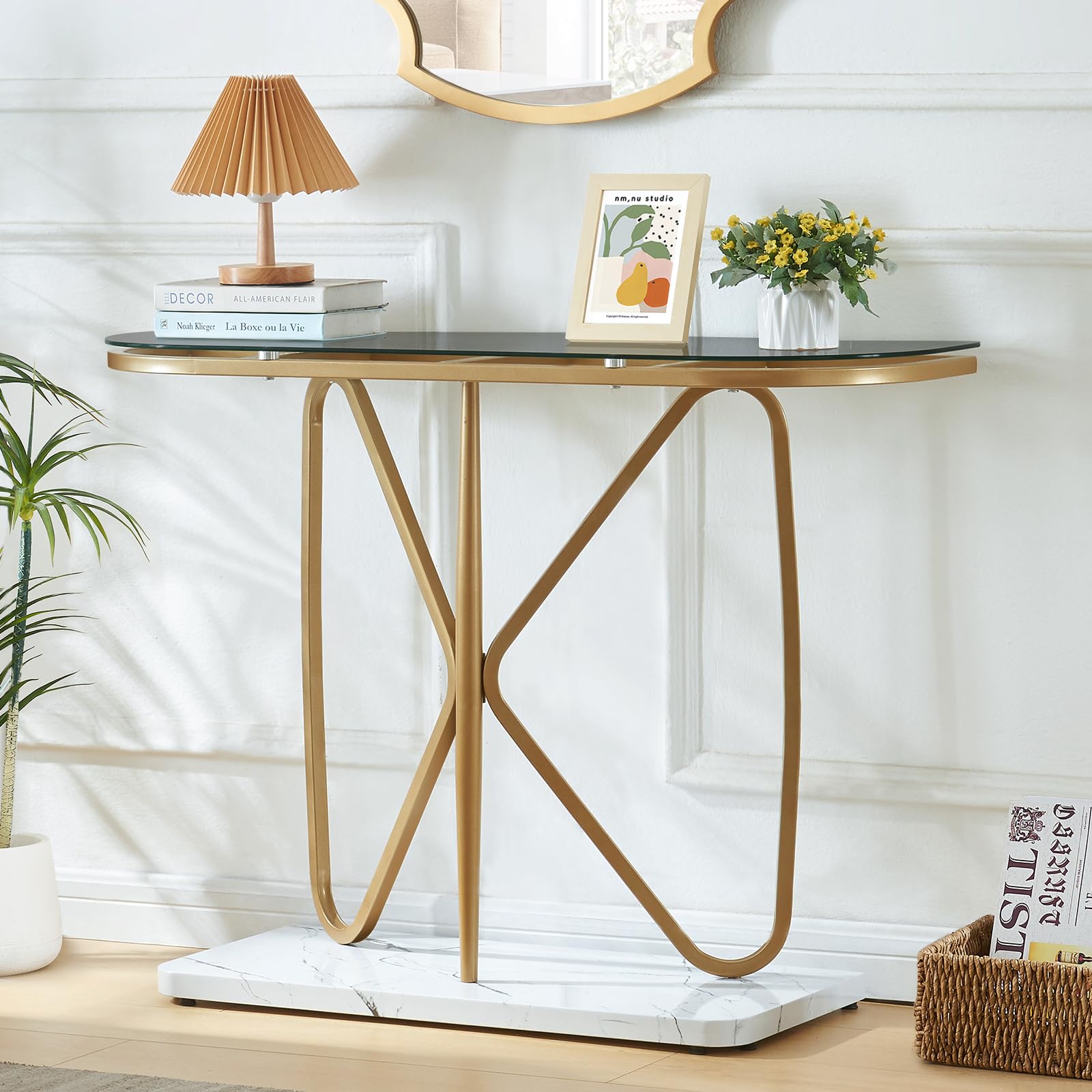 - 【Elegant & Versatile】Our entryway table offers plenty of surface space to display your favorite decorative items, vases or lamps. It also makes a thoughtful gift for someone special. Elegantly designed and practical, our glass console table add a touch of sophistication to any space. Whether you want to display treasured keepsakes or create a elegant atmosphere , this modern entryway table is a perfect choice.