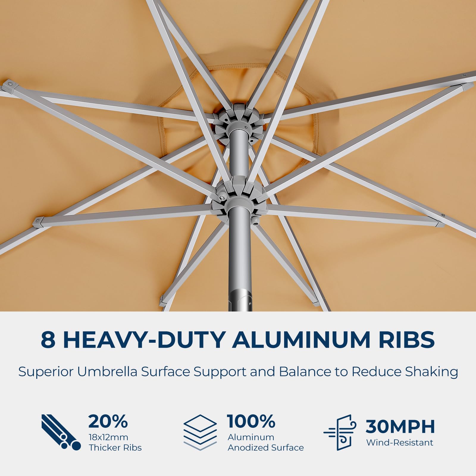 - ROBUST ALUMINUM FRAME: Durable 8-rib full aluminum frame with a 1.5-inch pole fits all outdoor table apertures. 20% thickened (12x18mm) 8 heavy-duty sturdy ribs provide superior umbrella surface support and balance to reduce shaking. With 30 MPH wind-resistant property. Anodized surface treatment brings excellent rust resistance.
