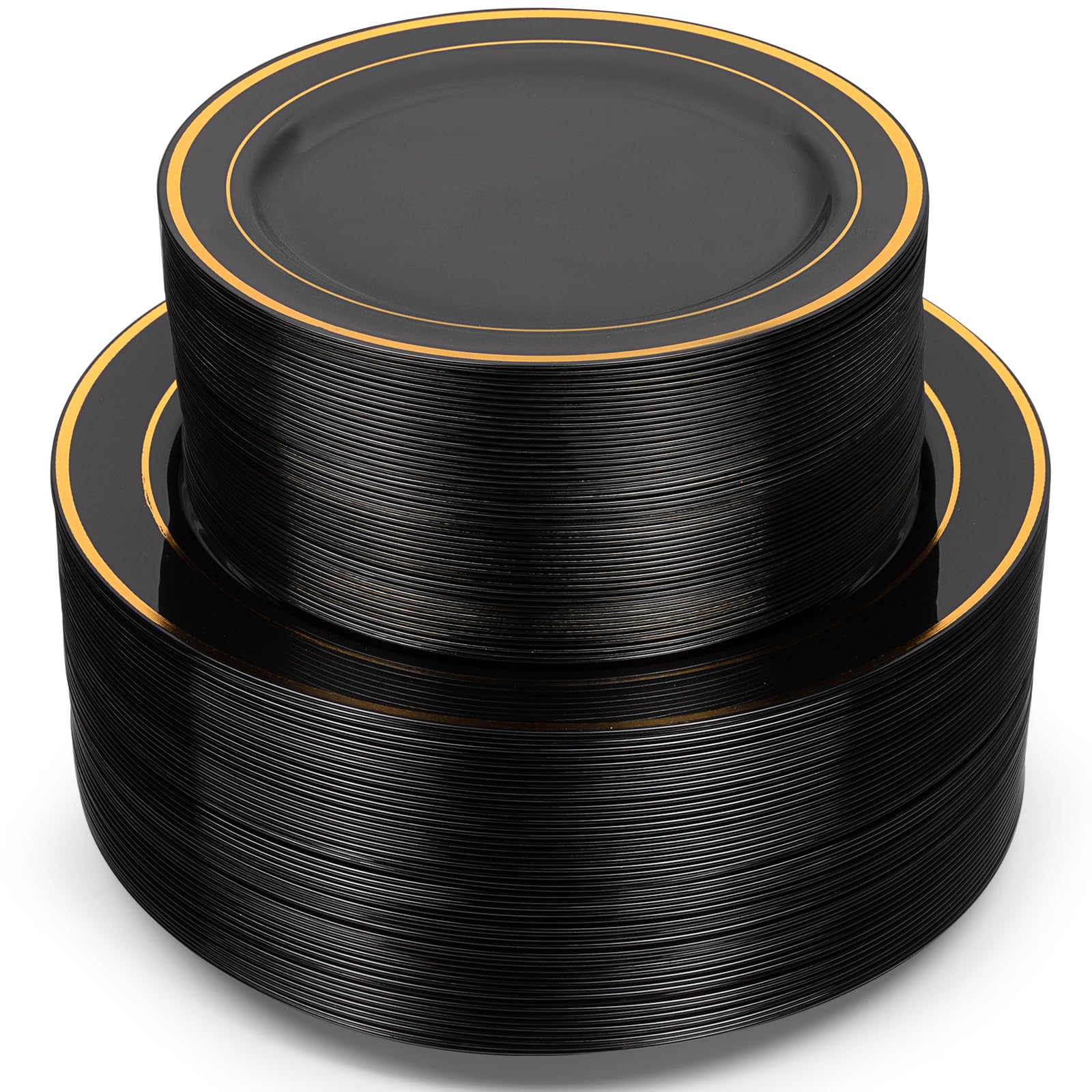 Homy Feel 100PCS Round Black Plastic Plates with Gold Rim Includes:50 Dessert Plates 7.5" Plates And 50 Dinner Plates 10.25" Plates Disposable Plates For Party Supplies