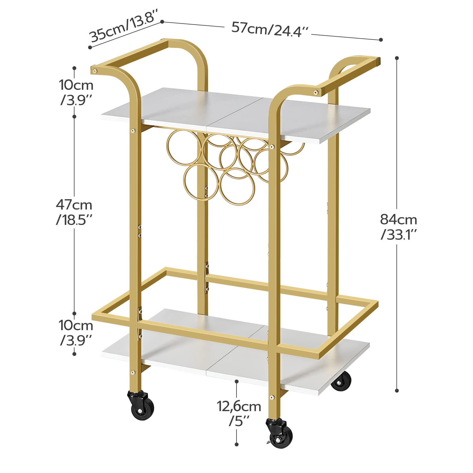 HOOBRO Gold Bar Cart for Home, 2-Tier Serving Cart with Lockable Wheels, Wine Cart with Wine Rack for Small Spaces, Rolling Wine Cart for Living Room, Party, Bar, White and Gold DW56TC01